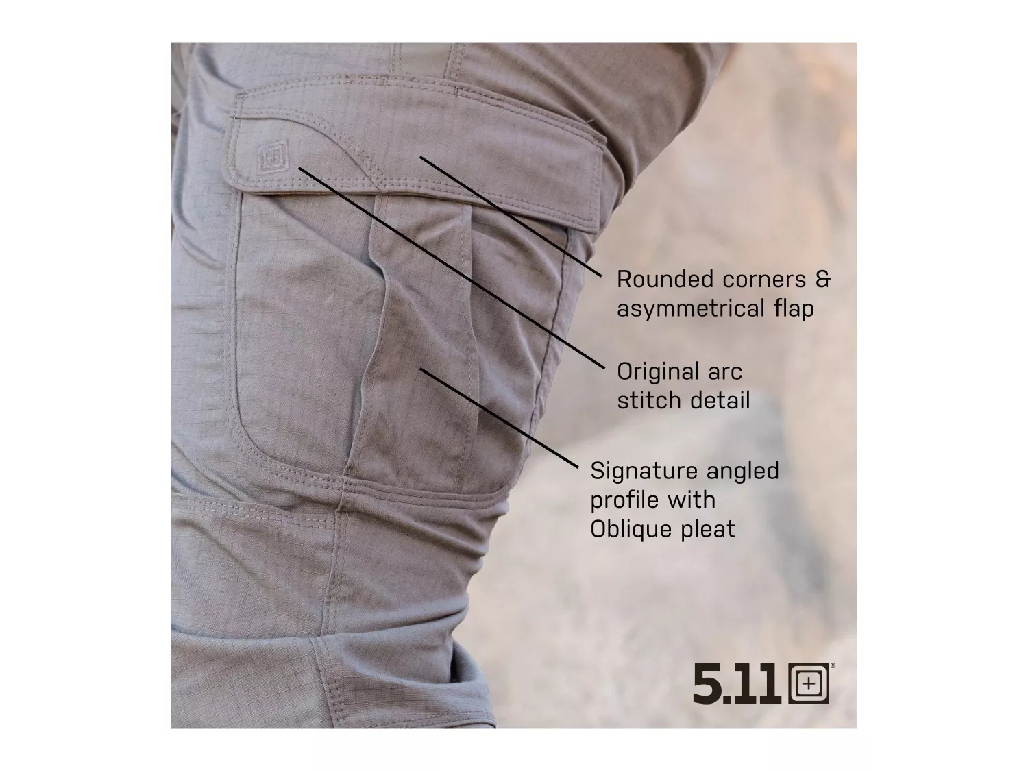 - Flex-Tac® materiál – pružný a odolný vůči znečištění, moderní tkanina z patentovaných vláken vyvinutá speciálně pro 5.11 Tactical