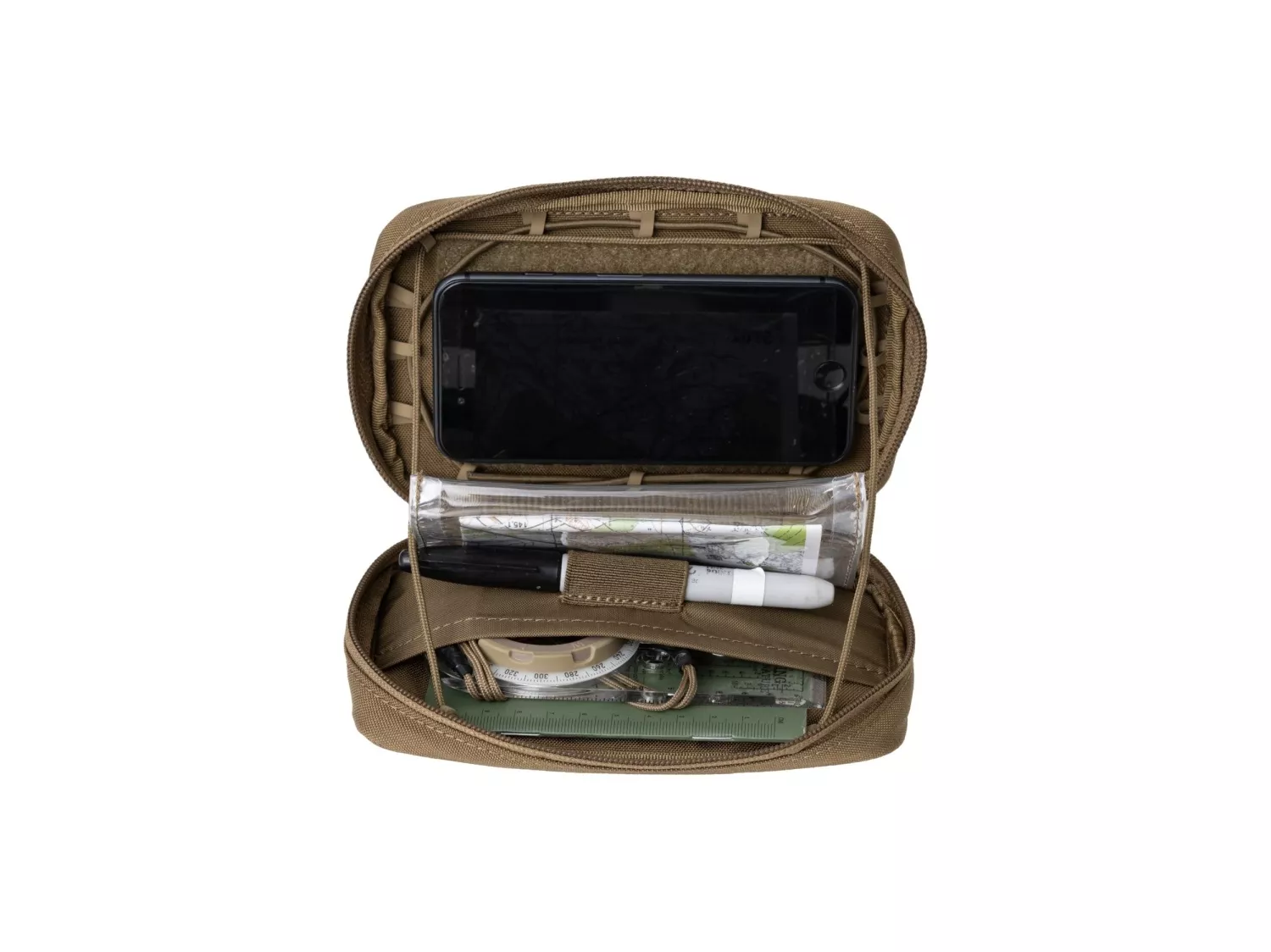 Admin Pouch je funkční administrativní pouzdro určené pro přenášení navigačního a komunikačního příslušenství v terénu. Interiér je navržen tak, aby pojal telefon a mapy. Adaptér suchého zipu umožňuje zabezpečení komunikačního telefonu, zatímco průhledná pouzdra pojmou mapy a poznámky.
