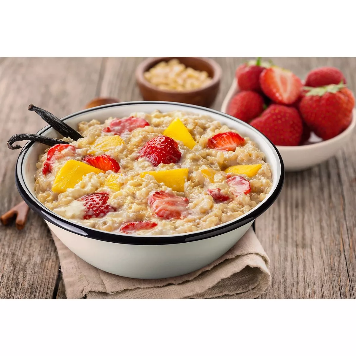 Rýžová kaše s jahodami, mangem a vanilkou
