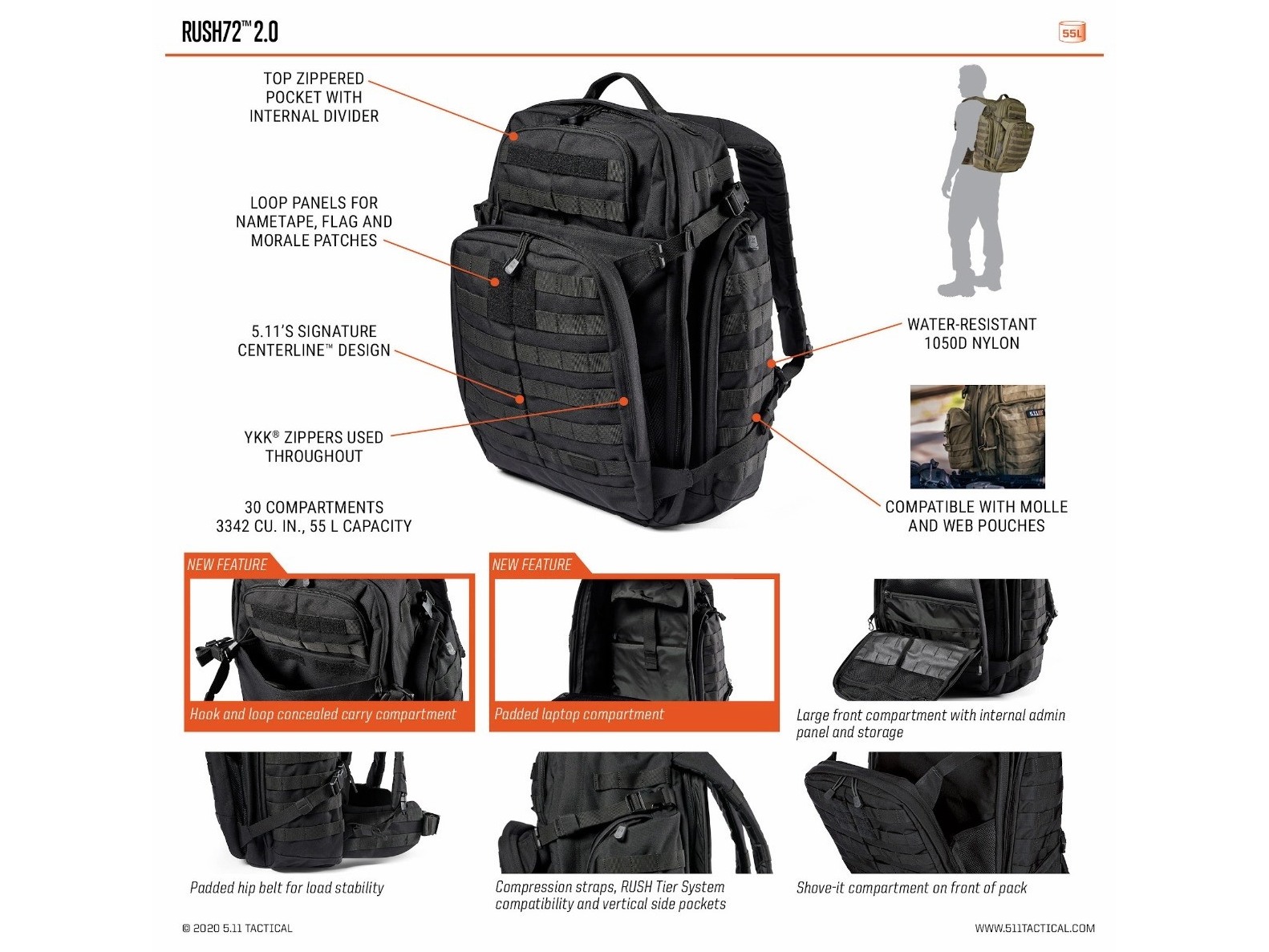 S působivým prostorem 55 L je nová generace RUSH72 ™ 2.0 dokonalým batohem s rozšířeným dosahem pro taktické mise, nasazení na velké vzdálenosti nebo pár dní ve skvělé přírodě. Nabijte jej veškerým nezbytným vybavením, které udržíte uspořádané v bezkonkurenčním systému oddílů určených pro vše od elektroniky, přes vybavení pro přežití, brýle, vodu, oblečení, vybavení pro kempování až po pera a dokumenty. RUSH72™ 2.0, navržený pro nejbrutálnější prostředí, je batoh nejvyšší úrovně pro kohokoli, jehož kritická výbava musí být snadno přístupná, když si to vyžaduje čas.