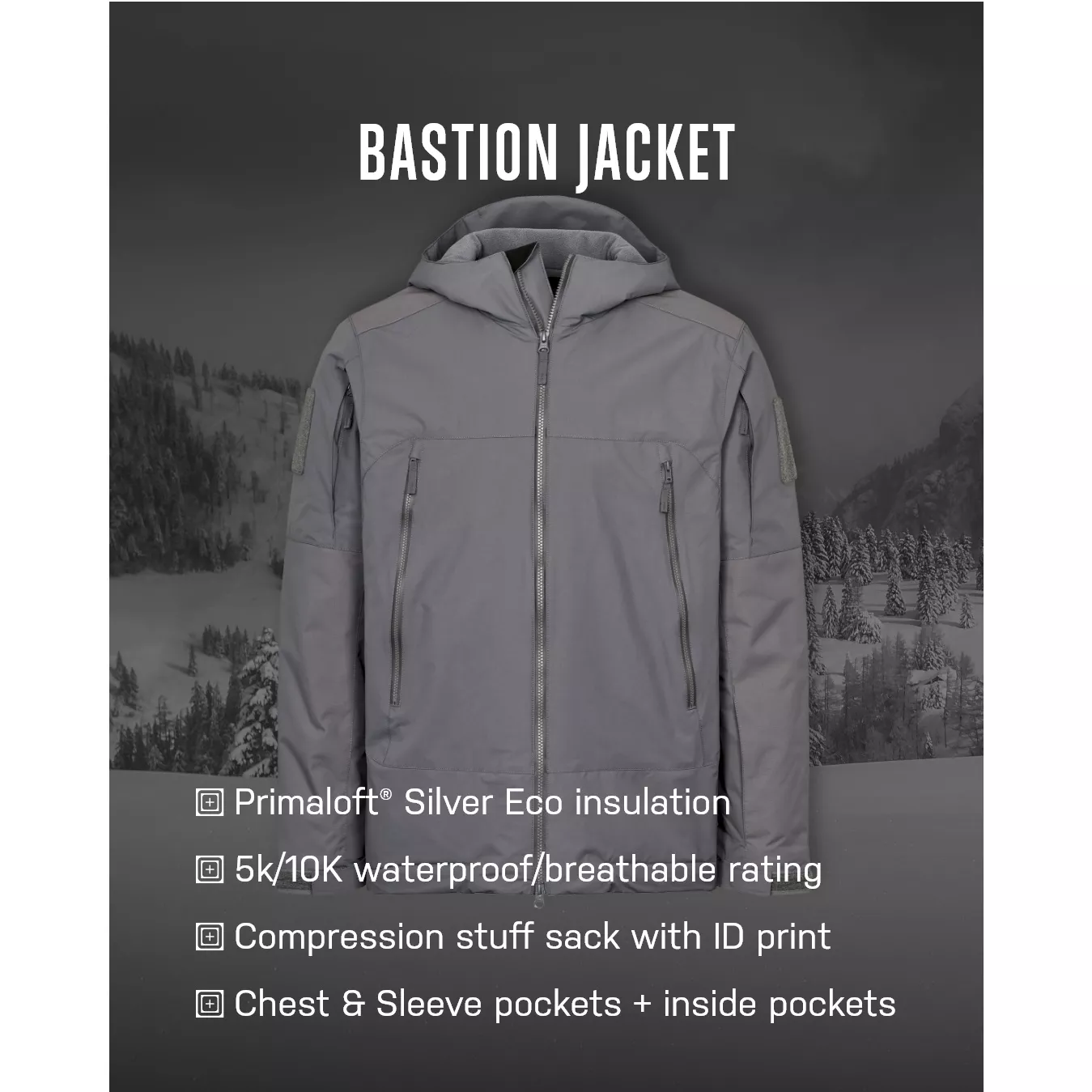 Ochrana před živly je to, k čemu byla Bastion Jacket vytvořena. S robustním 2L (DWR) tvrdým skořepinovým materiálem, voděodolnou/prodyšnou (5K/10K) a odolnou membránou je bunda také zateplena PrimaLoft Silver pro teplo a větší pohodlí. Bunda Bastion je vybavena náprsními a pažními kapsami na zip a navíc skrytou kapsou na levém rukávu.