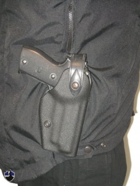 - Vysoko zapínatelný límec s odepínatelnou kapucí, kterou lze rovněž složit do límce. Dvoucestný zip od shora dolů. Po stranách vlevo i vpravo je všit vertikální zip pro umožnění přístupu ke zbrani.