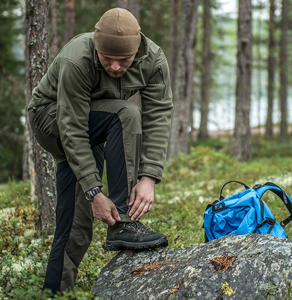 Nový model kalhot určený především pro outdoor a bushcraft využití kombinuje strečovou a pevnou látku, kterou je možné impregnovat voskem. Díky tomuto hybridnímu spojení jsou kalhoty opravdu všestranně využitelné, velmi pohodlné na nošení. Samozřejmostí jsou praktické prvky, které zvyšují odolnost a životnost kalhot, jako jsou například zesílené překlady kapes nebo zesílené oblasti kolen. Kalhoty jsou anatomicky střiženy, i díky tomu se přizpůsobí vašemu pohybu a neomezují vás. Všechny části kalhot, které jsou vystaveny větší zátěži, jsou ze silné látky. Zesílené je tedy téměř celá přední část, kargo kapy a sed. Naopak části kalhot, které jsou důležité pro volný pohyb, jako jsou zadní stehna, lýtka a přední sed, jsou vyrobeny zlátky elastické.