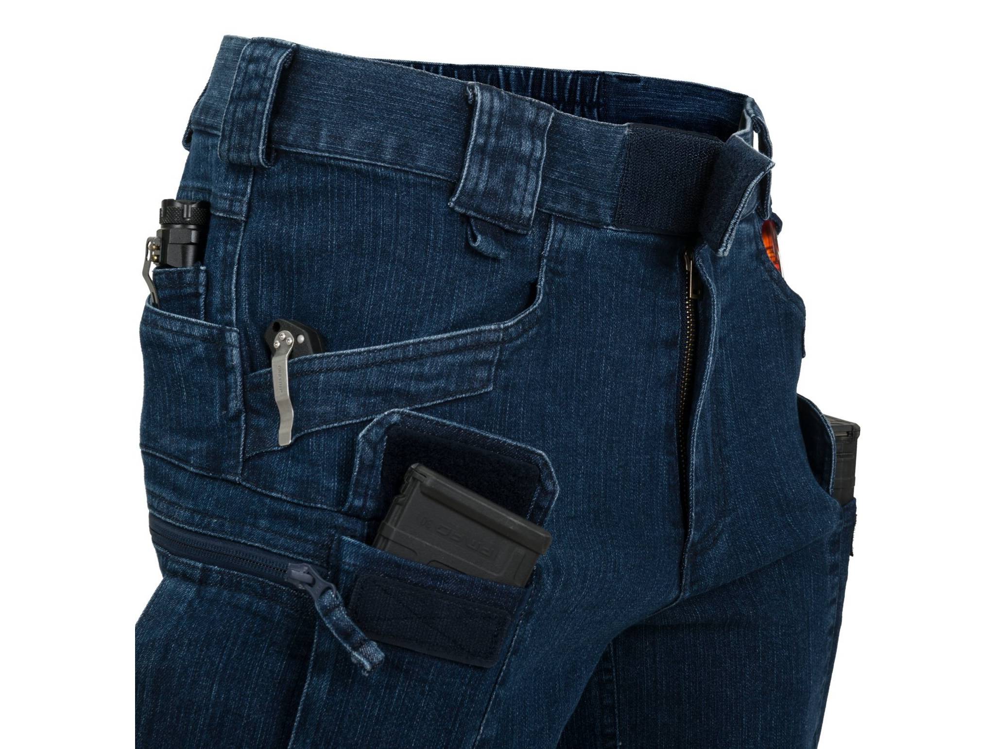 Díky důmyslnému rozložením kapes lze vybavení umístit blízko středové hmoty, kolem boků a pasu. Okraje předních a zadních kapes jsou zesílené, aby odolaly neustálému pohybu svítilen nebo jiného kapesního vybavení. Dvě přední kapsy se suchým zipem jsou dostatečně velké, aby unesly smartphone. Stehenní kapsy na zip vypadají ploše, ale jejich design umožňuje snadné přenášení peněženek
