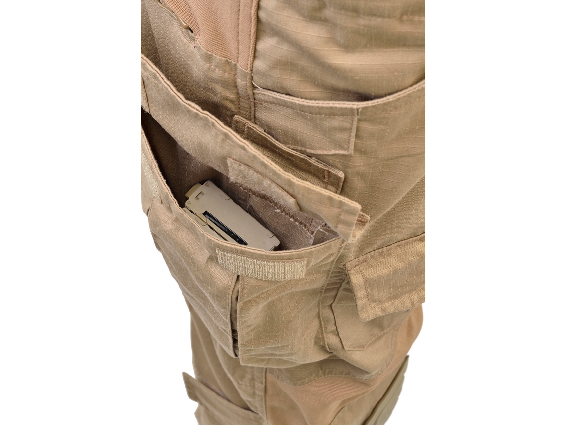 Ergonomické kalhoty s 10 kapsami, zesílené na zadní straně dvojitou vrstvou látky. Části na lýtkách a kotnících jsou nastavitelné suchým zipem. Polstrovaný a nastavitelný pas s vnitřním pásem s připevněním na suchý zip. Zesílené kapsy pro připevnění nožů, víceúčelových kleští atd. Anatomické kolenní vycpávky jsou odnímatelné. Vrstvy elastické tkáně na úrovni kostrče a kolen zajišťují pohodlí a dynamiku při činnostech vysokého fyzického stresu.
