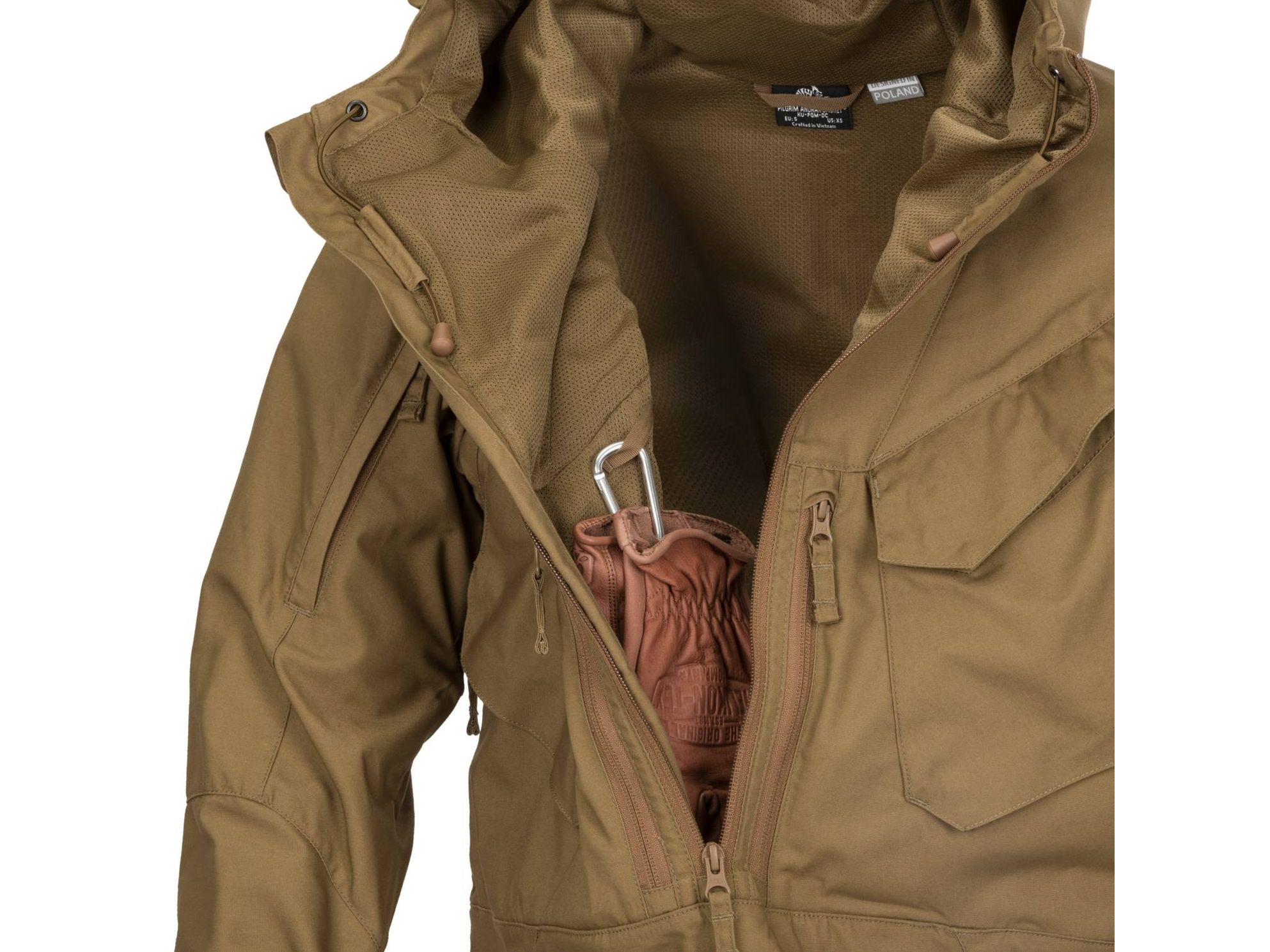 Bundu Pilgrim® navrhla společnost Helikon-Tex pro náročné outdoorové aktivity v dynamicky se měnícím počasí. Na základě desítky let osvědčené konstrukce byla bunda vylepšena tak, aby splnila očekávání moderních cestovatelů a přitom stále zasahovala do estetiky „staré gardy“. Četné kapsy umožní pohodlné umístění vybavení, přičemž díky jejich charakteristickému uspořádání je bude mít neustále k dispozici, a to i při práci v sedě nebo vkleče.
