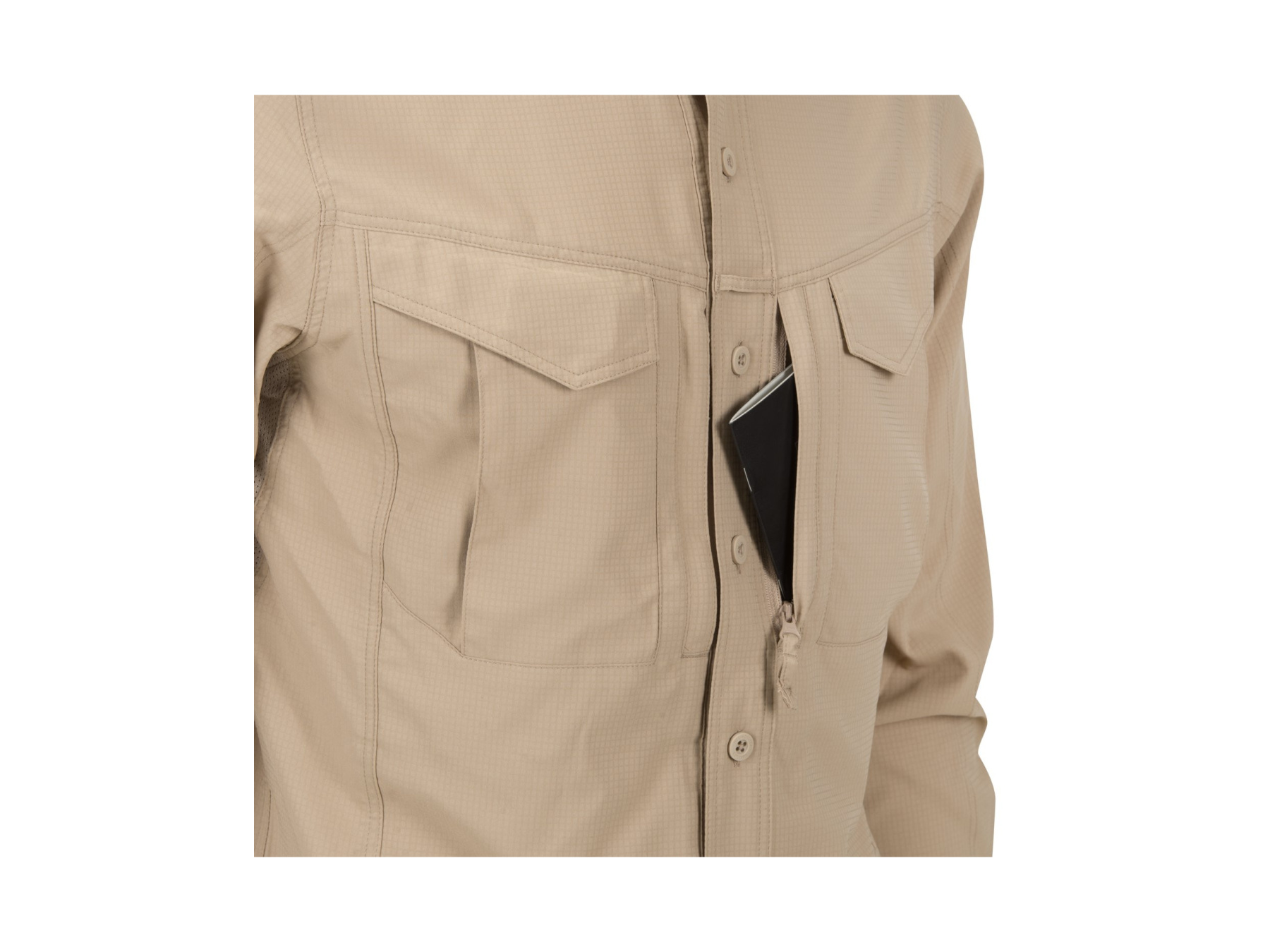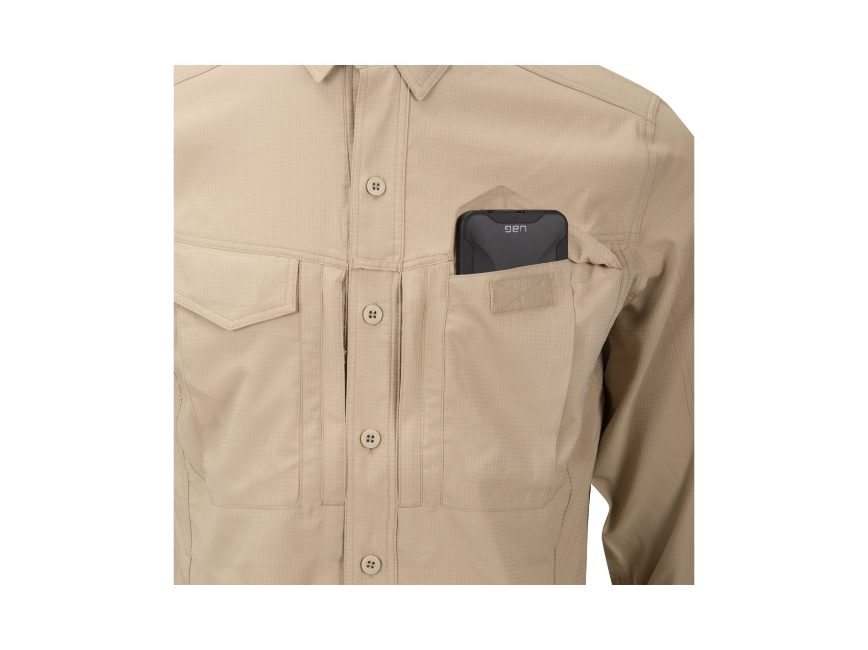 Navíc Vám tkanina UPF30 poskytne tu správnou UV ochranu, tak potřebnou v letních dnech. Celkový střih košile je stejný jako u klasických košil Defender Mk2. Košile se zapíná na decentní knoflíky značky Helikon-Tex®. Na hrudi jsou dvě klopové kapsy, uzavíratelné suchými zipy. Pod nimi jsou další ploché kapsy s YKK® zipy.