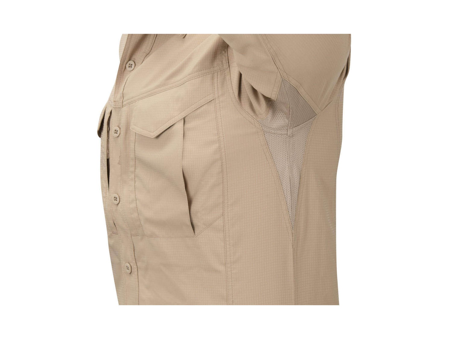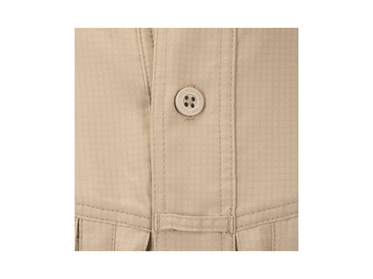 Navíc Vám tkanina UPF30 poskytne tu správnou UV ochranu, tak potřebnou v letních dnech. Celkový střih košile je stejný jako u klasických košil Defender Mk2. Košile se zapíná na decentní knoflíky značky Helikon-Tex®. Na hrudi jsou dvě klopové kapsy, uzavíratelné suchými zipy. Pod nimi jsou další ploché kapsy s YKK® zipy.