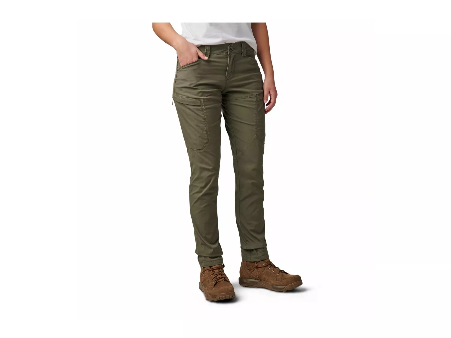 Účelové kalhoty pro ženu na misi. Přední a zadní kapsy, zadní praktické kapsy, nízkoprofilové cargo kapsy se skrytou vnitřní kapsou a skryté kapsy na klíče od pout uvnitř zadní části pasu a levého lemu tvoří celkem 8 kapes.