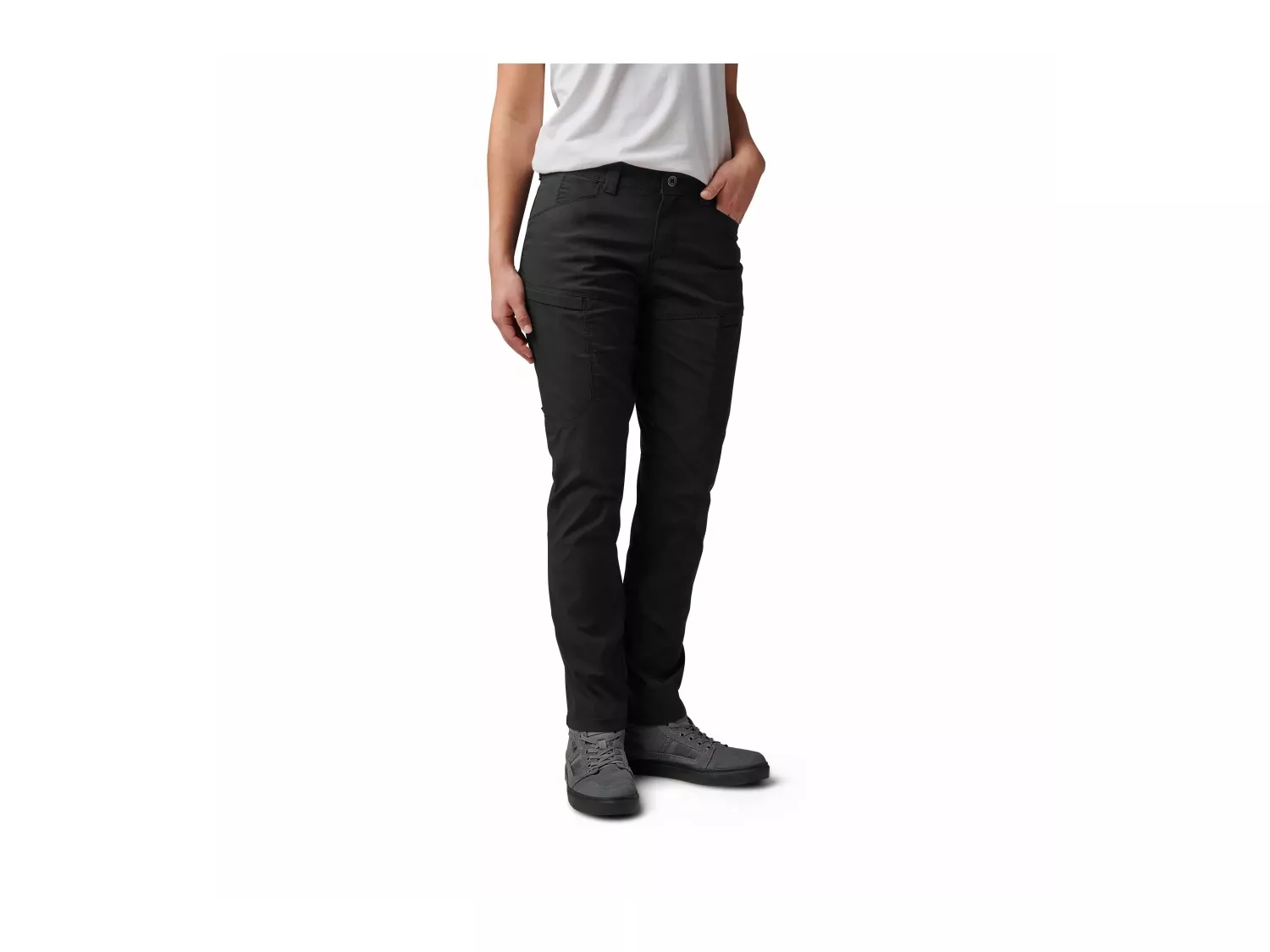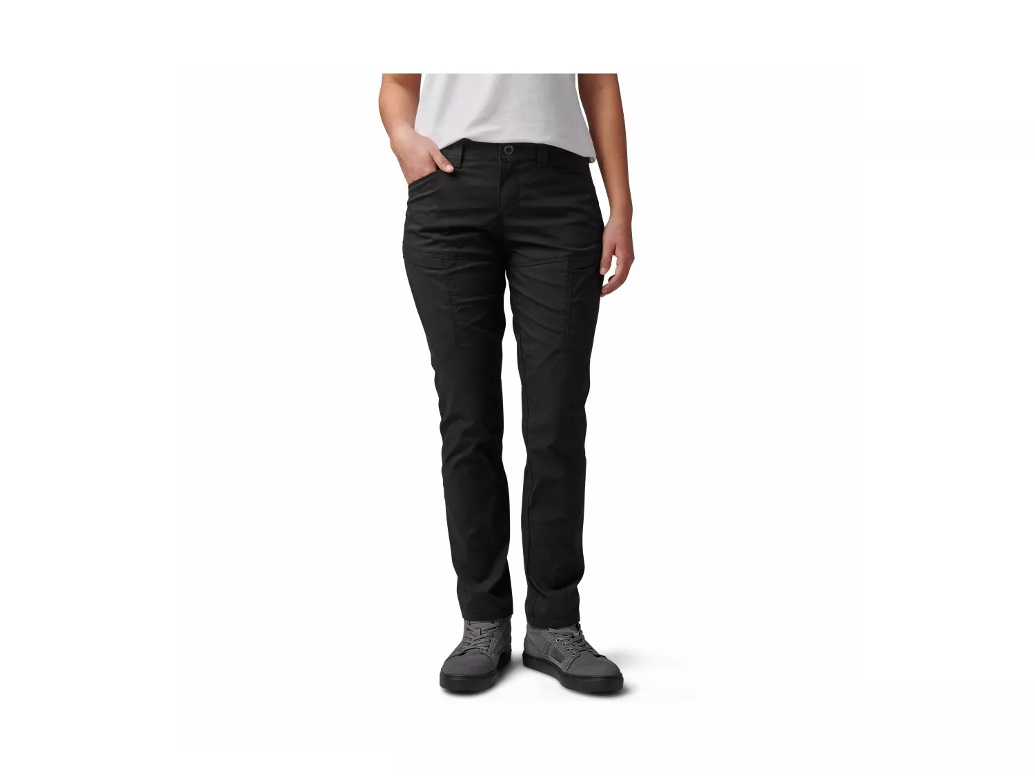 Účelové kalhoty pro ženu na misi. Přední a zadní kapsy, zadní praktické kapsy, nízkoprofilové cargo kapsy se skrytou vnitřní kapsou a skryté kapsy na klíče od pout uvnitř zadní části pasu a levého lemu tvoří celkem 8 kapes.