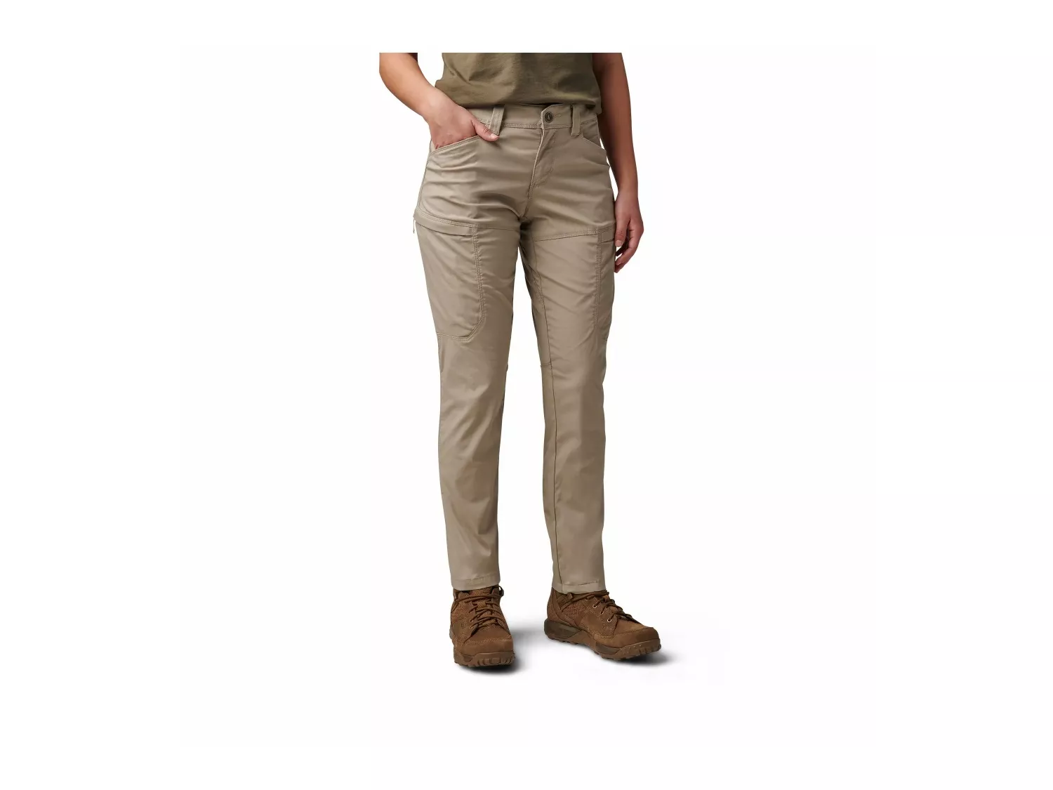 Účelové kalhoty pro ženu na misi. Přední a zadní kapsy, zadní praktické kapsy, nízkoprofilové cargo kapsy se skrytou vnitřní kapsou a skryté kapsy na klíče od pout uvnitř zadní části pasu a levého lemu tvoří celkem 8 kapes.
