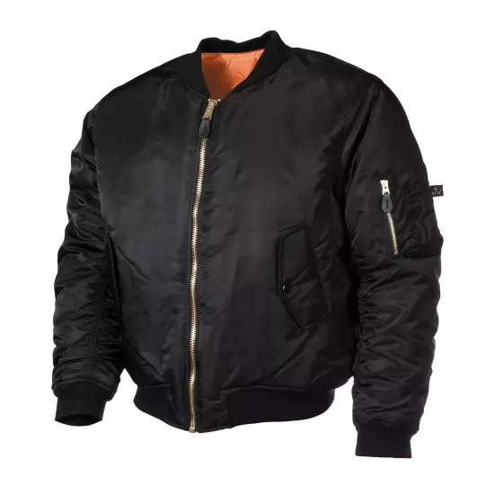 Klasická americká oboustranná pilotní bunda MA1 s pevným předním zipem, dvěma prostornými prošívanými kapsami s klopou a našitá kapsa na rukávu vlevo s pevným kovovým zipem. Bunda má dále 4 kapsy na pera, 2 vnitřní kapsy se zapínáním na patentky a dvojitou pletenou manžetu na límci, pasu a rukávech. Uvnitř se nachází oranžová podšívka