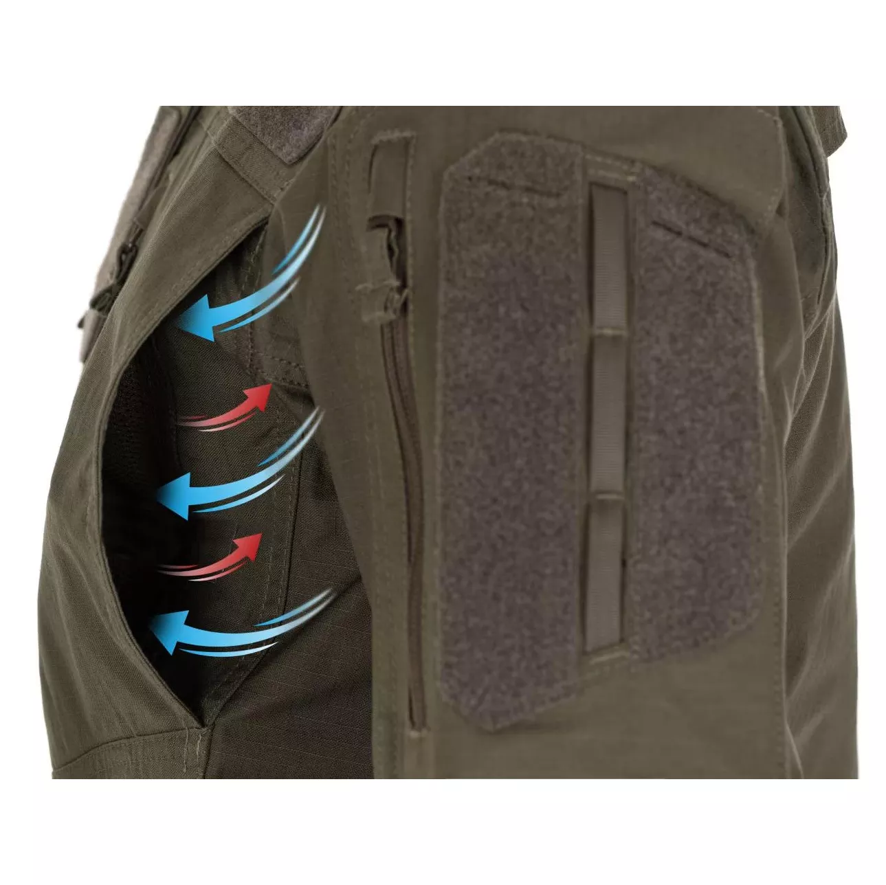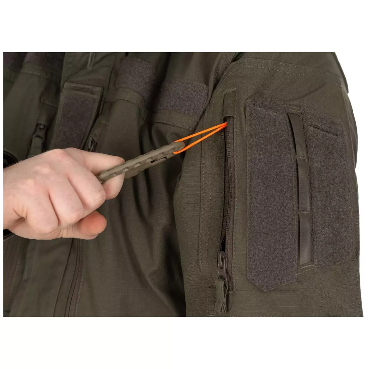 Na obou pažích se nachází úložná kapsa opatřená YKK reverzním spirálovým zipem. Uvnitř kapsy jsou k dispozici poutka pro upevnění vybavení nebo uložení zdravotnického vybavení. Kapsy na vnější části rukávu nahoře mají VELCRO® panely a popruhy pro připevnění indikátorů IFF, V-Lite® nebo jiných jednotek.