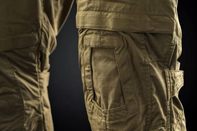 - Kalhoty jsou vybaveny dvěma kapsami na kolena pro všechny typy chráničů kolen včetně chráničů kolen Crye Precision® AirFlex™ Field Knee Pad pro speciální vnější kapsy. Toto řešení je patentováno společností Crye a kalhoty 4M OMEGA jsou pro jeho použití licencovány. Kapsy na chrániče kolen jsou výškově nastavitelné pomocí elastických šňůrek a zapínání v horních kapsách kalhot.