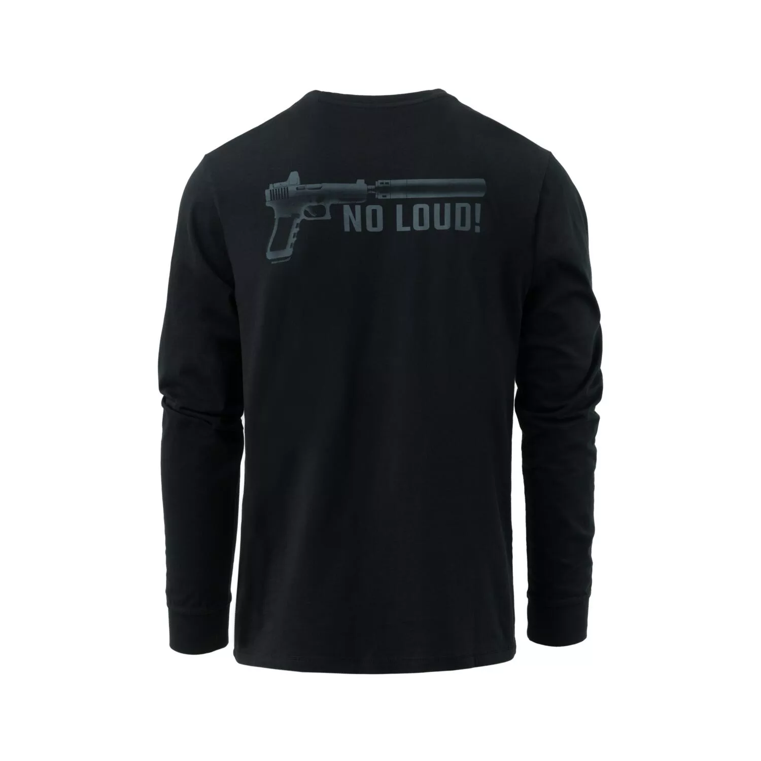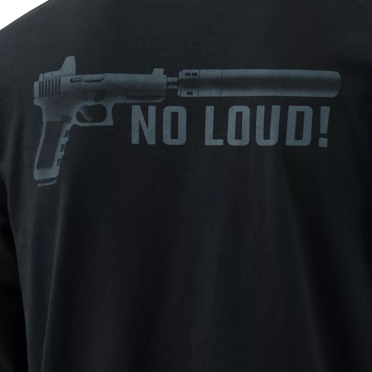 Dlouhý rukáv, vzor s pistolí s tlumičem a heslem "No Loud!" na černém pozadí.