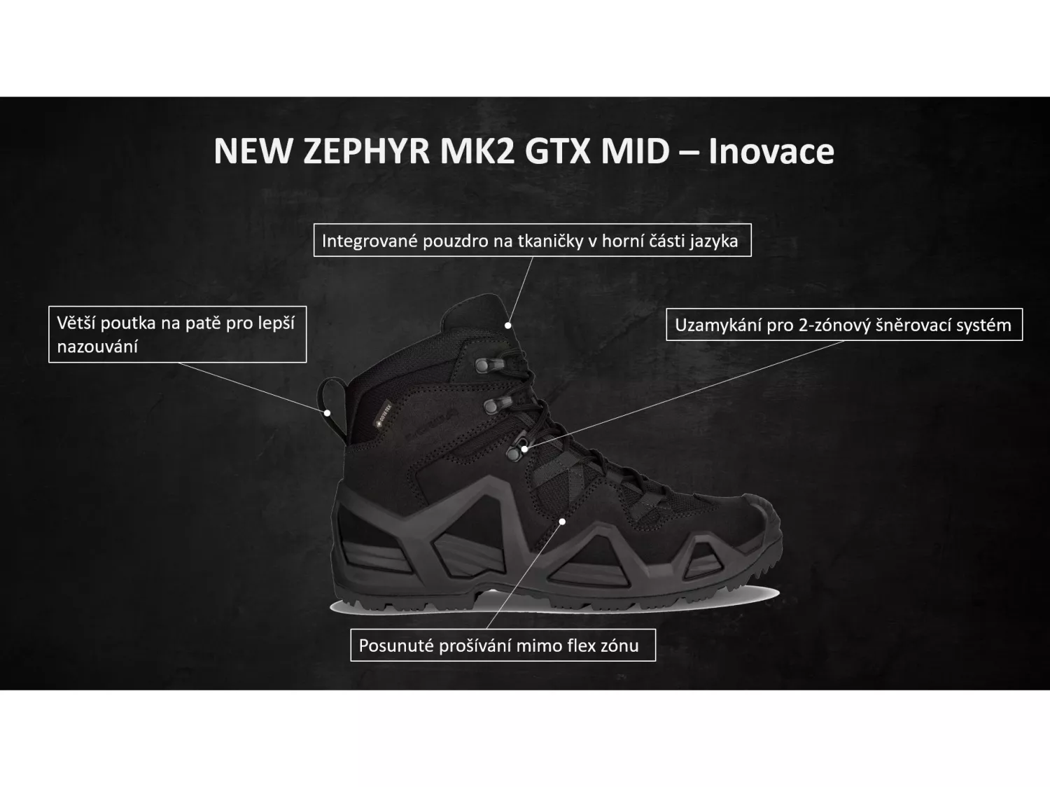 Obuv Lowa Zephyr MK2 GTX Mid představuje další fázi ve vývoji této legendární obuvi. Díky kombinaci hbitosti, lehkosti a stability je ideální pro použití ve vojenských nebo policejních speciálních jednotkách, ale i u běžného personálu. Svršek MID-CUT poskytuje potřebnou podporu při rychlém slaňování a umožňuje plnou volnost pohybu při boji zblízka.