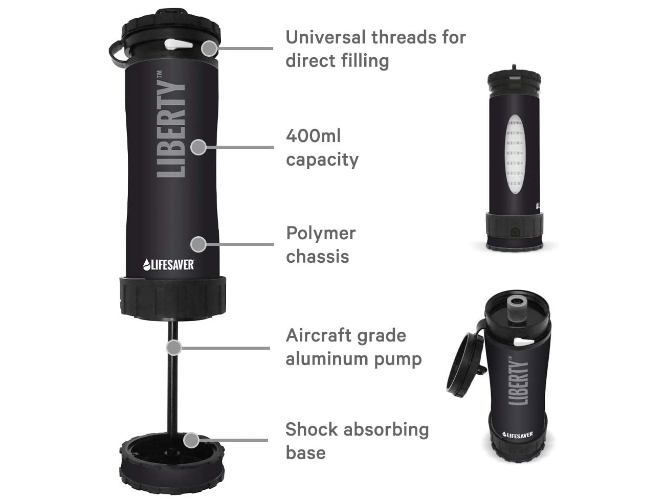 Láhev na čištění vody LifeSaver Liberty ™ je první a jediný přenosný čistič vody na světě - láhev s kombinovanou pumpou.