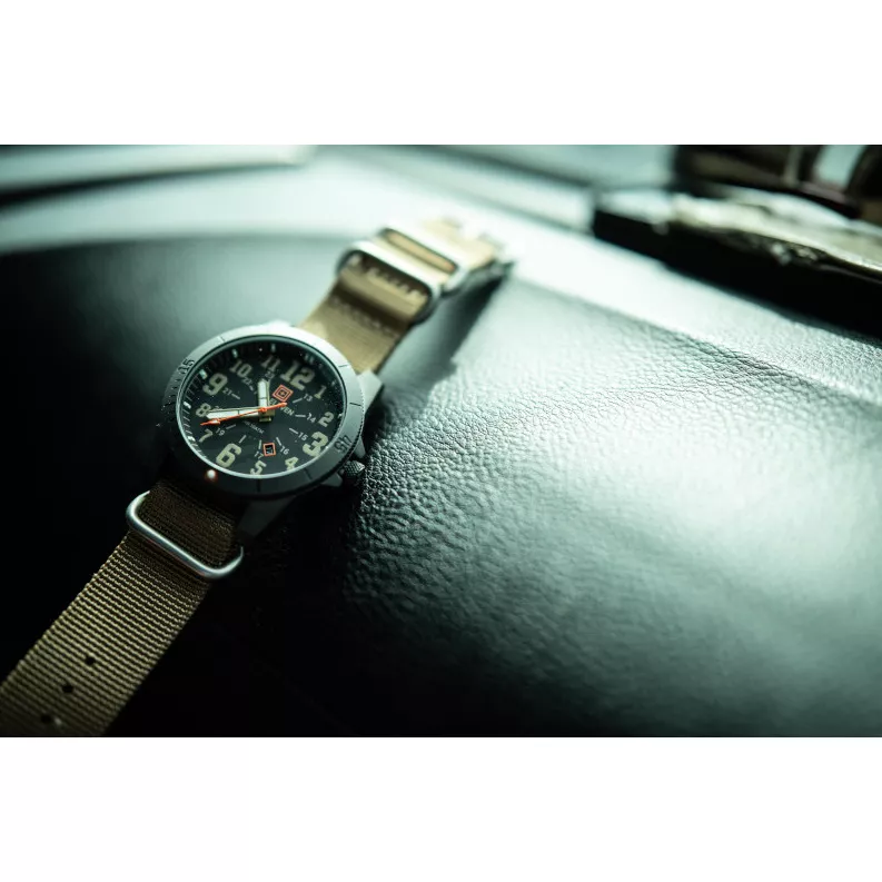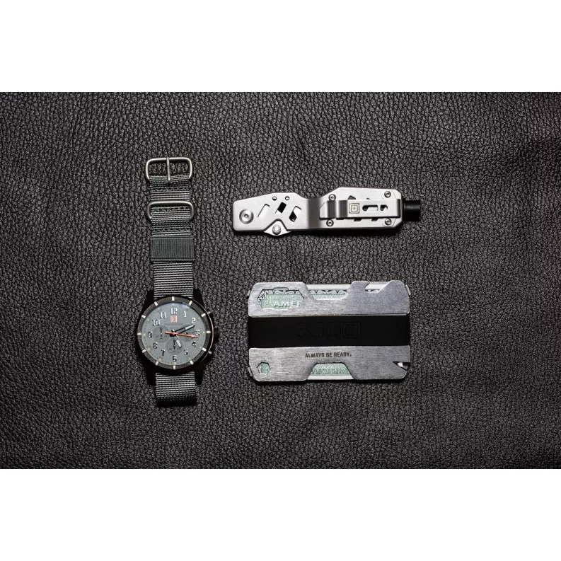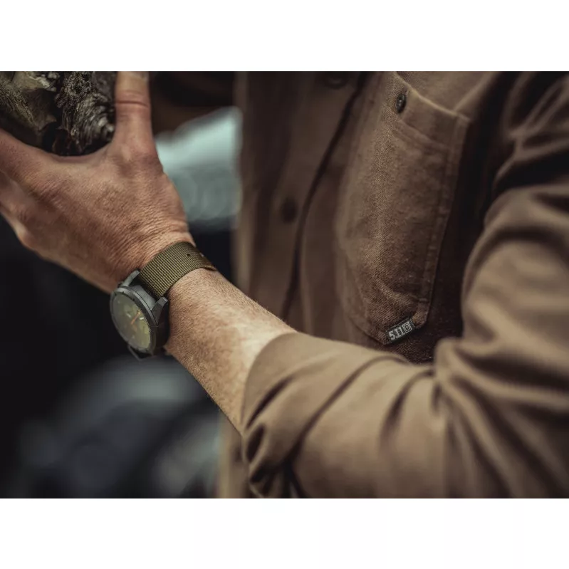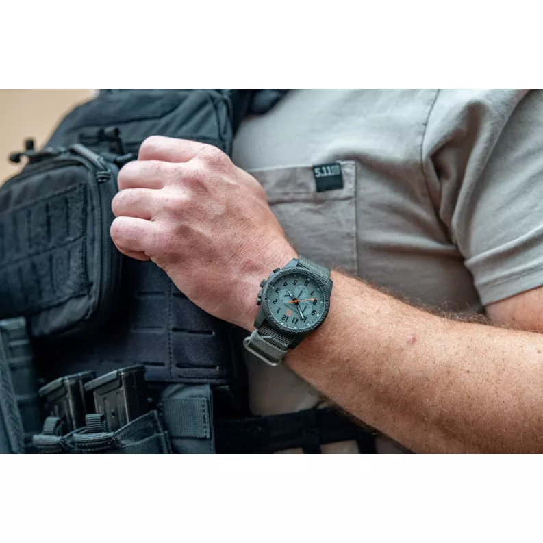Hodinky 5.11 Outpost Chrono poskytují přesné měření času s taktickým vzhledem. Pouzdro je z nerezové oceli 44 mm s krytem IP a povrchem z minerálních krystalů. Outpost má vytahovací korunku pro nastavení času a tlačítka start/stop pro funkce stopek.