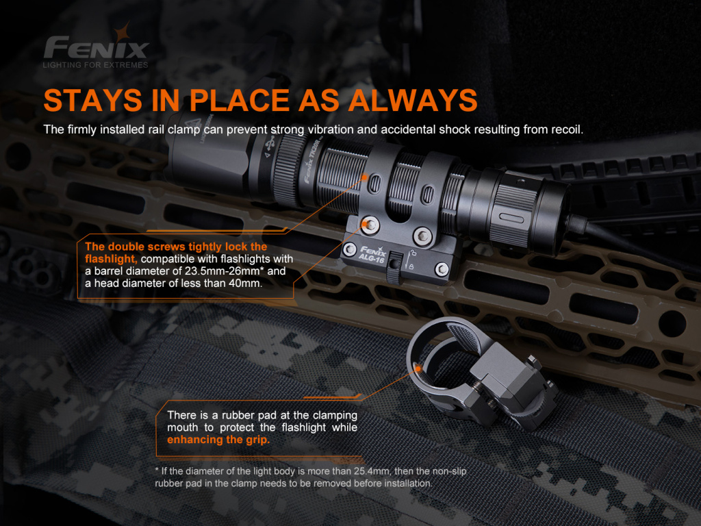 Kovová montáž Fenix ALG-16 umožňuje připevnit svítilnu na zbraňové rozhraní M-LOK (Magpul Lock). Je kompatibilní se svítilnami s průměrem těla 23,5 - 26,0 milimetrů a průměrem hlavy do 40 milimetrů. Vhodná například pro svítilny Fenix TK11 TAC, TK16 V2.0, TK22 V2.0, TK22 UE, TK22 TAC, TK25 IR, TK25 R&B, TK25 Red, TK25 UV, TK26R, PD32, PD35, PD36 TAC, PD36R PRO, HT30R, UC35, FD41. Montáž ALG-16 lze na M-LOK rychle upevnit pomocí otočného kolečka.