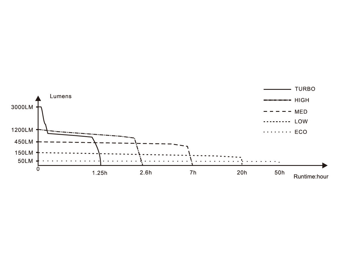 - Šest režimů výkonu: 3000 lumenů (1,25 hodiny) -> 1200 lumenů (2,6 hodiny) -> 450 lumenů (7 hodin) -> 150 lumenů (20 hodin) -> 50 lumenů (50 hodin) - Stroboskop (3000 lumenů).