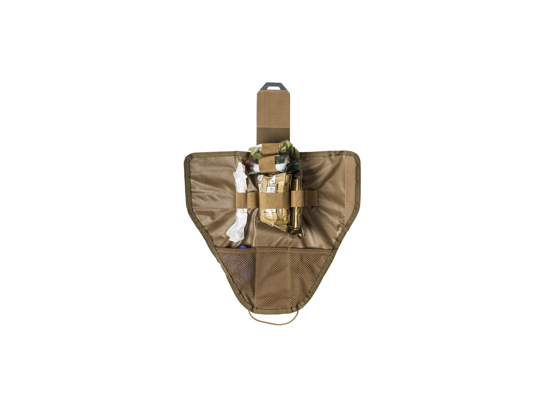 Úzké svislé pouzdro první pomoci. Tato třídílná lékárnička je navržena tak, aby se vešla na boční panel hrudní soupravy nebo na opasek.