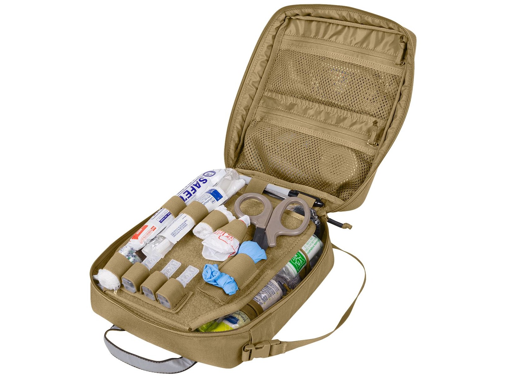 Interiér byl navržen tak, aby umožňoval přizpůsobené rozčlenění pro uložení zdravotnického materiálu. K dispozici jsou dvě ploché vnitřní kapsy uzavřené zipem, vyrobené ze síťoviny, které umožňují rychlou identifikaci obsahu bez jejich otevření. Elastické smyčky slouží k uložení zdravotnického materiálu. V případě, že je vak použit jako sada pro střelnici, jsou tyto smyčky ideální pro držení jednotlivých předem zabalených polních obvazů. Smyčky jsou vyrobené z elastického provazu a umožňují individuální úpravy v závislosti na typu doplňků držených ve smyčce. Med bag navíc obsahuje odnímatelný vyztužený panel pokrytý na obou stranách smyčkovým suchým zipem pro připevnění vložek s háčkem a suchým zipem (kompatibilní s Versatile Insert System®) obsažených v sadě. Měl být používán k přepravě okluzivních obvazů na rány na hrudi - výztuha zabraňuje jejich ohnutí, což by mohlo poškodit obvaz. Med kit se ideálně hodí do boční kapsy na brašně Range Line Rangemaster®, kde může být připevněn k panelu na suchý zip a odtržen pro nasazení. Sada Automotive Med Kit® byla vyrobena z prvotřídních materiálů, jako je Cordura® 500D, se zipy YKK® a nylonovými páskami.