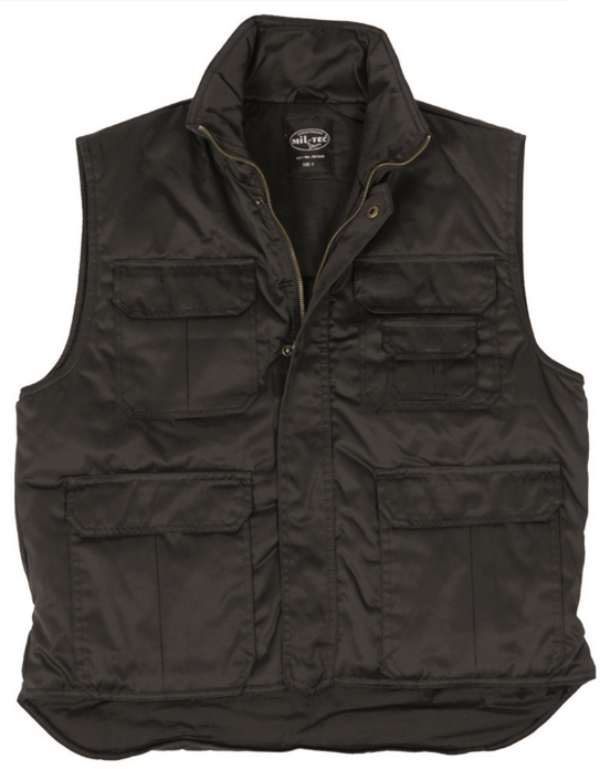Klasická prošívaná vesta s bavlněnou podšívkou a mnoha kapsami, 4 našité s klopami, jednu malou na náprsní kapse, a dvě boční kapsy.