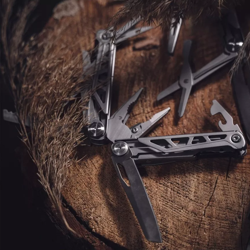 Vyrobeno s přesností z nerezové oceli 440 pro čepel a nůžky a z nerezové oceli 420 pro další komponenty, to vše uloženo v odolné rukojeti z nerezové oceli 420. Tento všestranný nástroj obsahuje kleště s úzkými i běžnými čelistmi, štípačky na dráty, čepel, nůžky, víceúčelové štípačky, otvírák na lahve s plochým šroubovákem, otvírák na konzervy s plochým šroubovákem, křížový šroubovák, výstružník, pilník na kov, pravítko, pilku a odizolovací kleště.