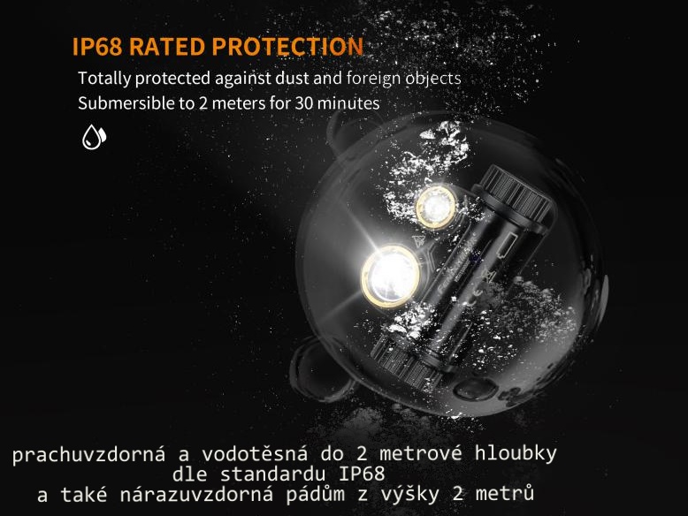 - Součástí balení je Li-ion akumulátor Fenix 18650 3400 mAh, popruhy na hlavu, nabíjecí kabel USB-C, náhradní o-kroužek.