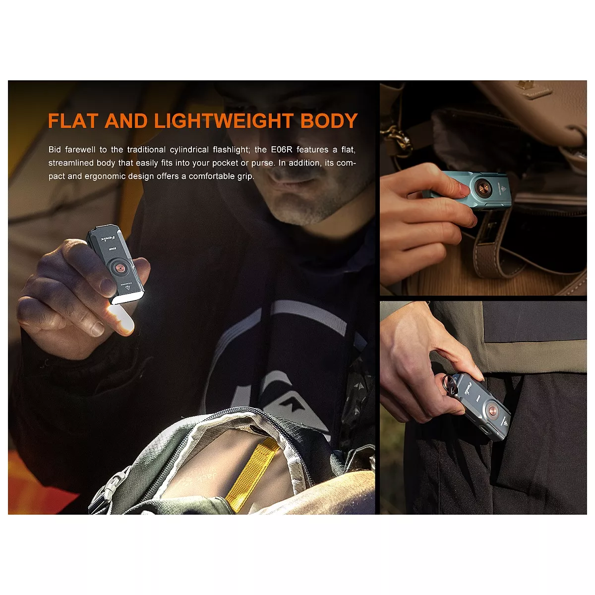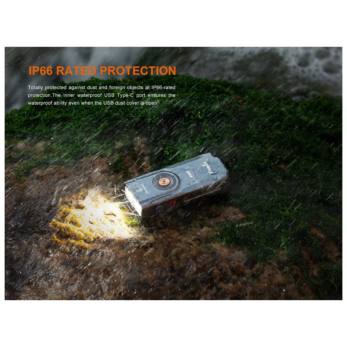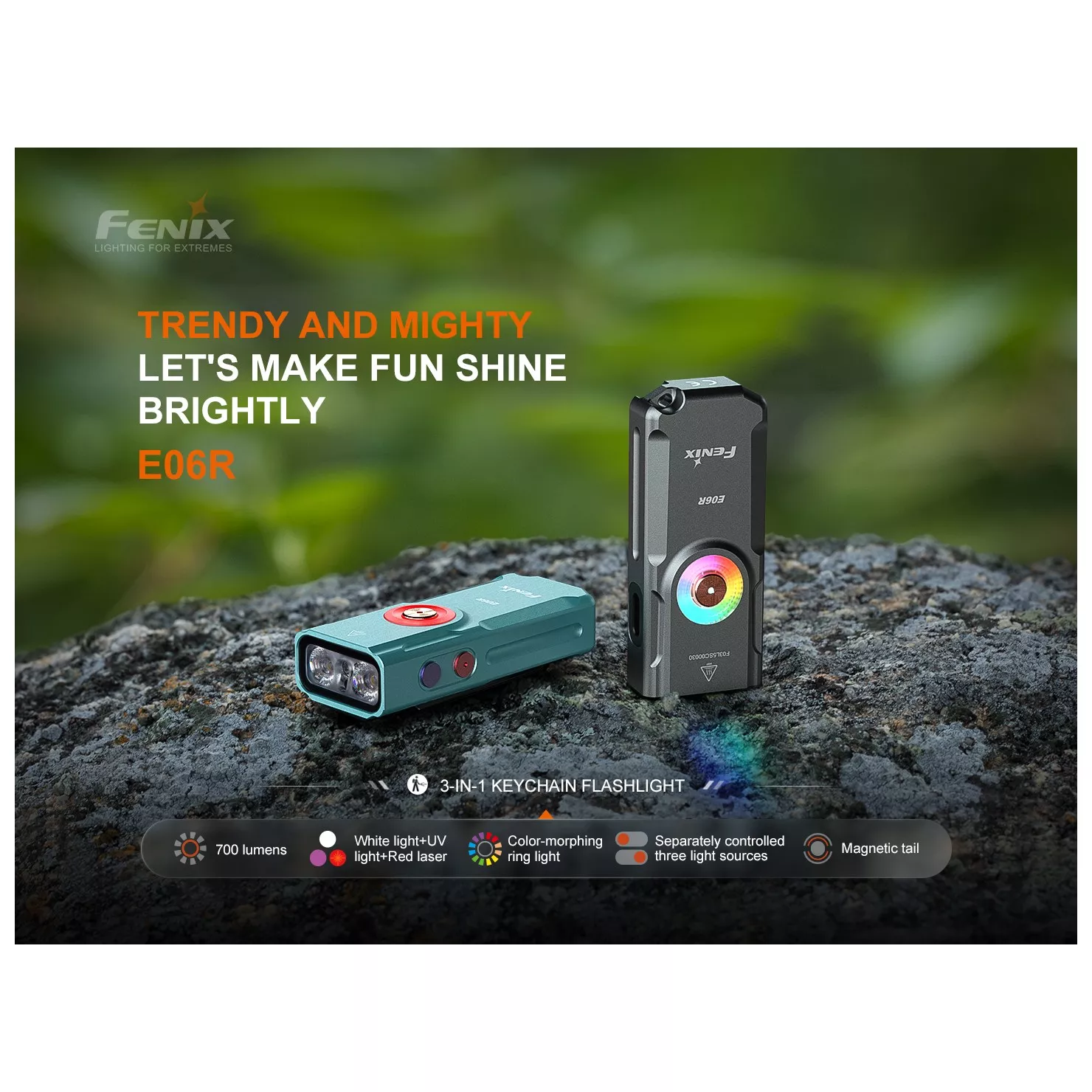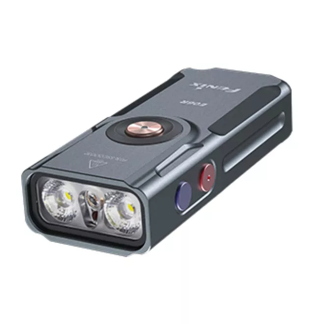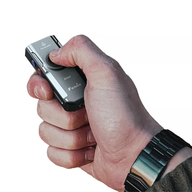 Fenix E06R je větší variantou úspěšné miniaturní nabíjecí svítilny Fenix E03R V2.0. Proti ní má nejen vyšší výkon, ale i ultrafialové světlo a laserové ukazovátko. I přes kompaktní rozměry a váhu pouhých 54 gramů nabízí vysoký světelný tok až 700 lumenů (ANSI). Světelný kužel rovnoměrně osvětluje široký prostor až do vzdálenosti 110 metrů. K napájení slouží integrovaný akumulátor s kapacitou 750 mAh, který se nabíjí přes moderní USB-C konektor na boku svítilny. K dispozici jsou celkem čtyři režimy bílého světla, UV světlo s vlnovou délkou 365 nm o síle 580 mW, červený laser (ukazovátko ≤0,39 mW) a několik režimů tzv. Breathing light - světla okolo spínacího tlačítka o síle 0,5 až 1 lumen, které využijete pro nenápadnou signalizaci, či identifikaci umístění svítilny. Svítilna je dodávána včetně pevného klipu, takže ji můžete uchytit na kapsu, popruh batohu či kšilt čepice a uvolnit si tak při svícení ruce. Díky magnetu v patce svítilny ji můžete přichytit k čemukoli železnému. Praktický je také indikátor stavu nabití baterie v tlačítku. Svítilna je skvělá pro EDC a díky malým rozměrům, plochému tvaru a váze ji můžete mít stále u sebe.