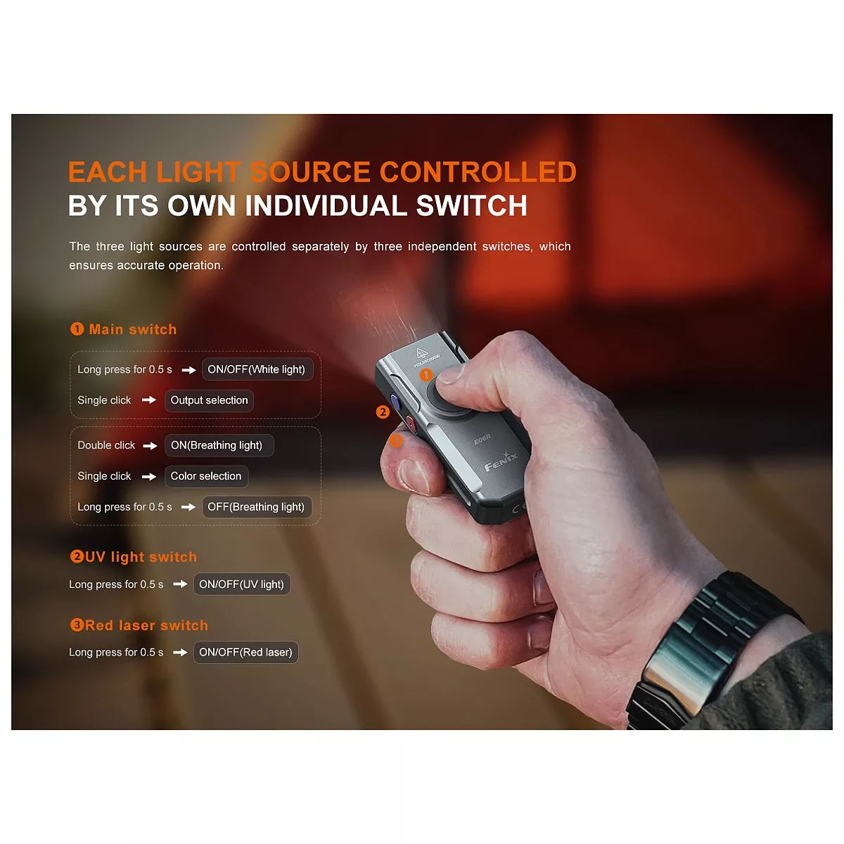 Pro zapnutí či vypnutí bílého světla podržte hlavní tlačítko zhruba 0,5 vteřiny. Režimy výkonu můžete kdykoliv během provozu přepínat stisknutím tlačítka. Pro zapnutí Breathing light vypněte svítilnu a dvakrát rychle stiskněte tlačítko. Pro vypnutí podržte 0,5 vteřiny.
