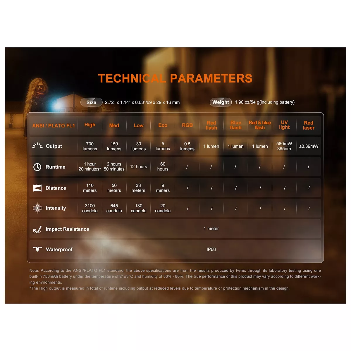Všechny parametry svítilny (světelný tok, doba provozu na baterie, vodotěsnost, nárazuvzdornost a dosvit) jsou změřeny v souladu s normou ANSI/NEMA FL 1-2009.