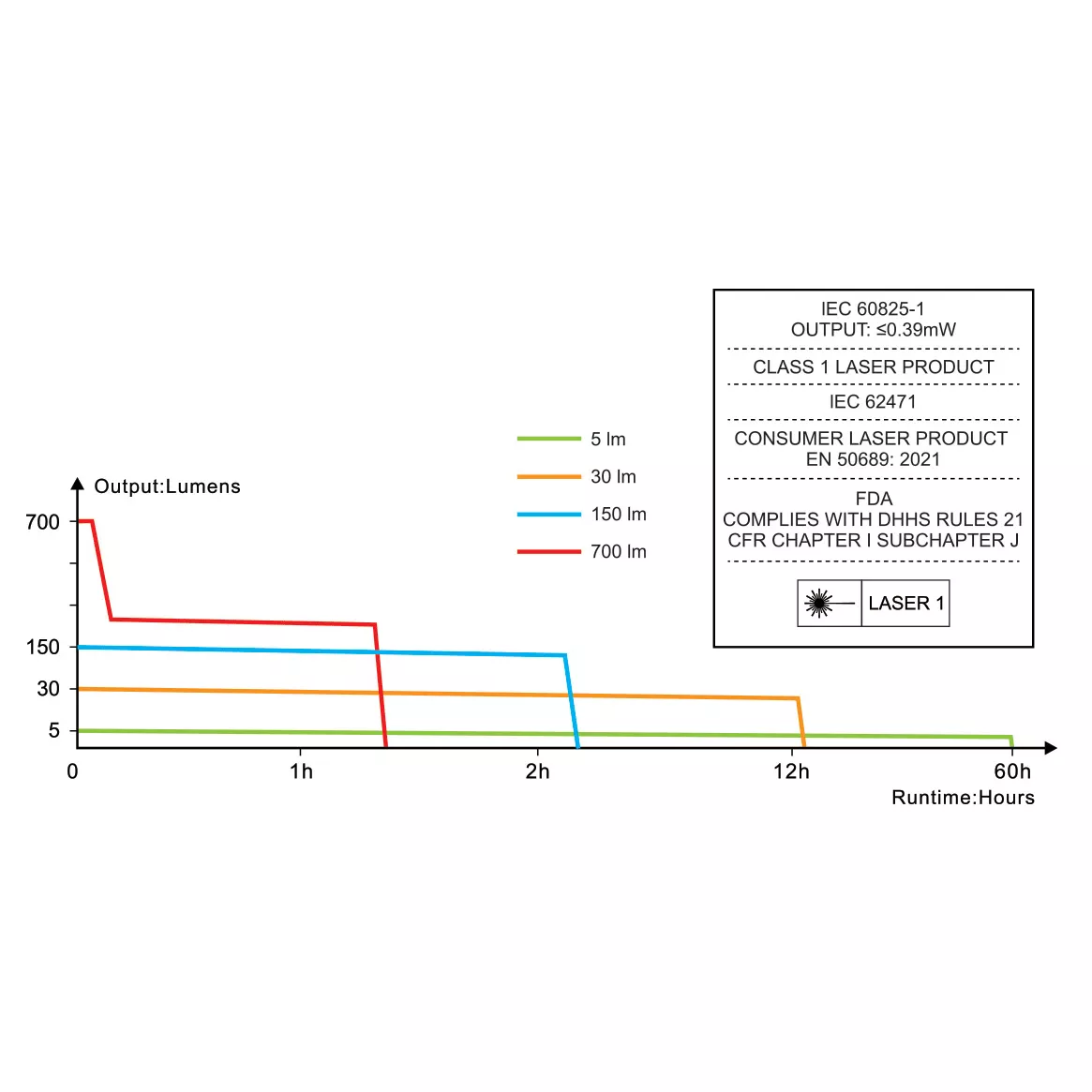 - Čtyři režimy bílého světla: 700 lumenů (1,3 hodiny) -> 150 lumenů (2,8 hodiny) -> 30 lumenů (12 hodin) -> 5 lumenů (60 hodin).