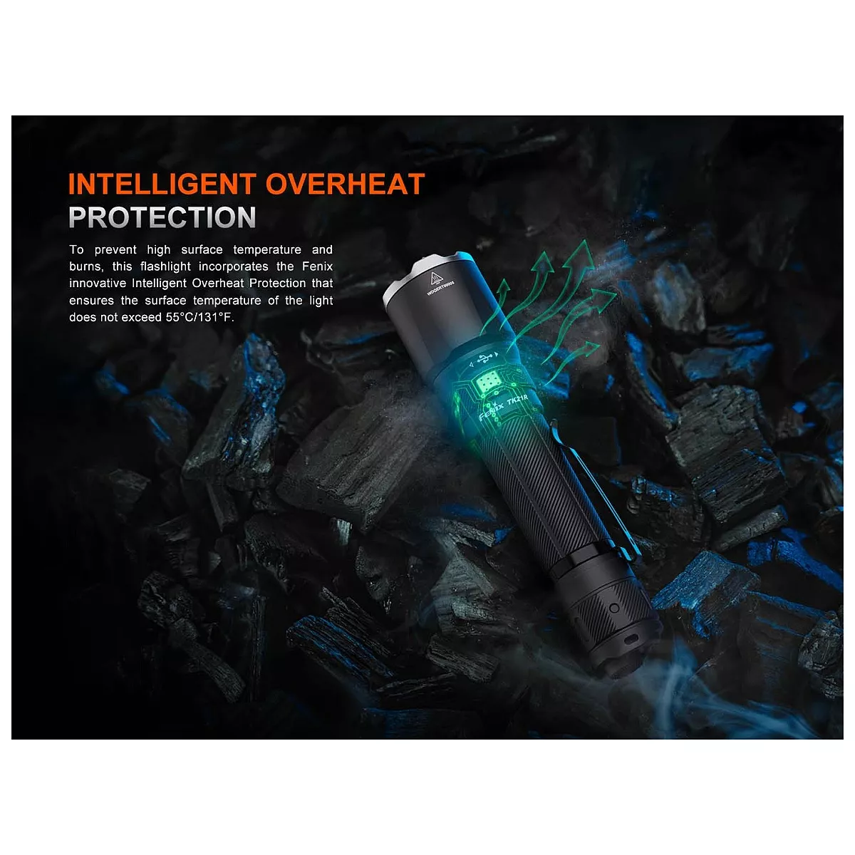 Inteligentní ochrana proti přehřátí - vzhledem k tomu, že svítilna dosahuje obrovského výkonu 3600 lumenů, dochází u ní k nárůstu teploty. Pokud teplota překročí 55°C, dojde k automatickému snížení výkonu. Jakmile teplota klesne pod 55°C, výkon se opět automaticky zvýší.