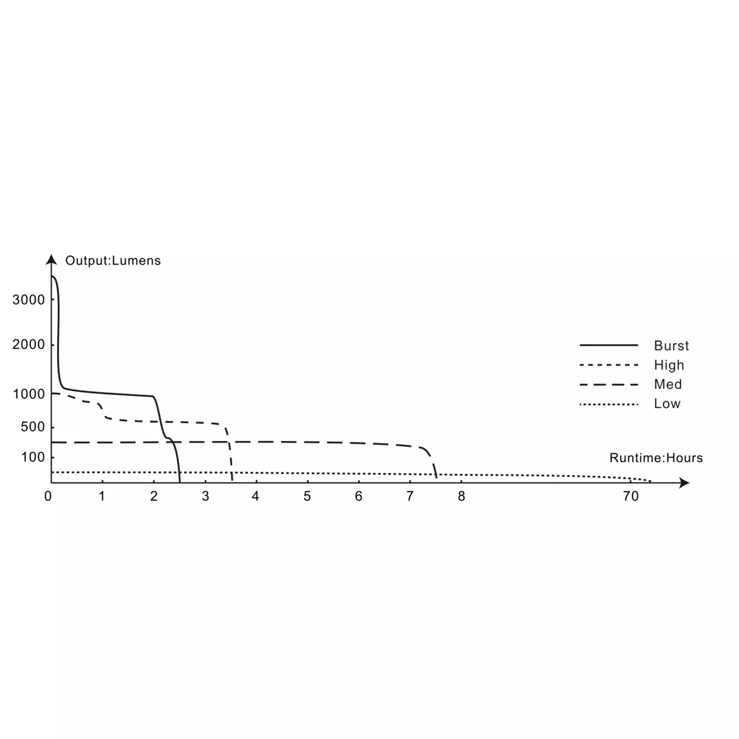 - Pět režimů výkonu: burst 3600 lumenů (2,5 hodny) -> 1000 lumenů (3,5 hodny) -> 350 lumenů (7,5 hodny) -> 30 lumenů (72,5 hodiny) -> stroboskop 3000 lumenů (stroboskopické blikání s proměnlivou frekvencí).