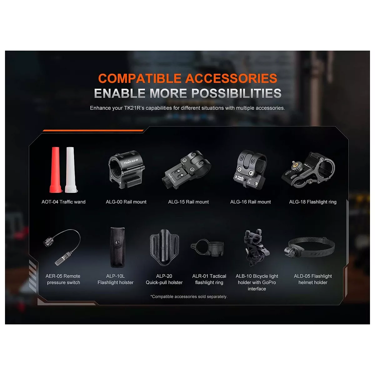 - Se svítilnou je kompatibilní i následující příslušenství: montáž na M-LOK ALG-16, rychloupínací montáž na lištu ALG-15, rychloupínací montáž na lištu ALG-00, kovová magnetická montáž na hlaveň, plastová magnetická montáž na hlaveň, montáž svítilny na optiku, kovová montáž na optiku, popruh Fenix ALD-05 pro použití svítilny na přilbě, držák na kolo Fenix, pouzdro ALP-10L, pouzdro ALP-20.