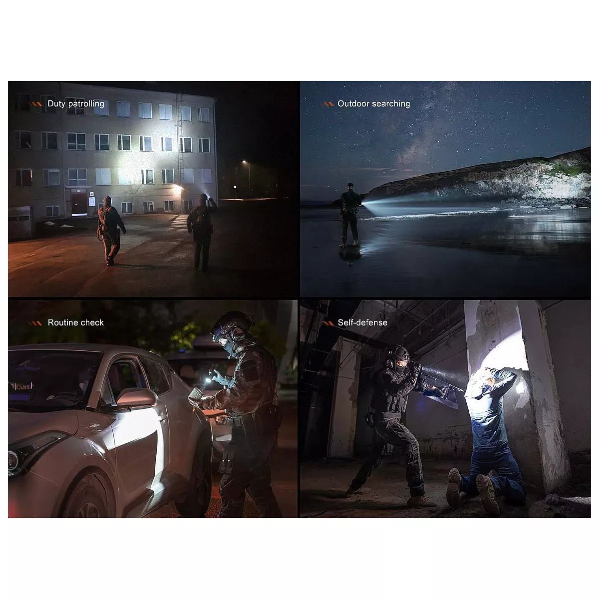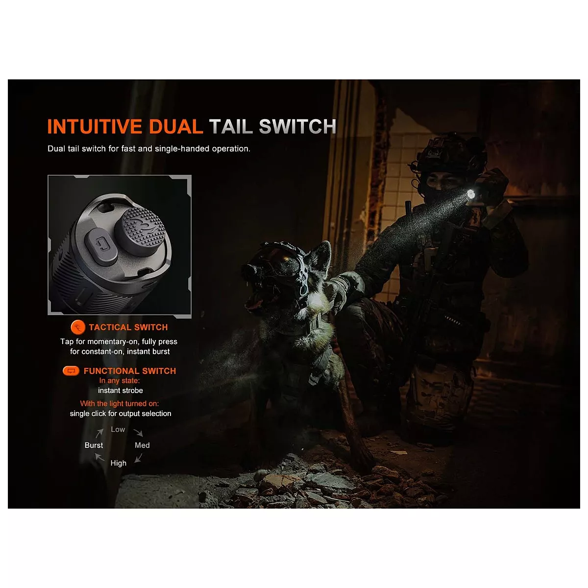 Pro zapnutí zmáčkněte větší taktické tlačítko umístěné na konci svítilny, pro okamžitou aktivaci tlačítko namáčkněte. Stiskem vedlejšího přepínacího tlačítka můžete kdykoliv během provozu přepínat mezi režimy výkonu. Pro přepnutí do zábleskového režimu při zapnuté svítilně přidržte přepínací tlačítko zhruba 0,5 sekundy. Pro zapnutí svítilny přímo do stroboskopického režimu stiskněte a držte přepínací tlačítko. Režim BURST (3600 lumenů) lze také kdykoliv přímo aktivovat podržením hlavního taktického tlačítka po dobu 0,5 sekundy.