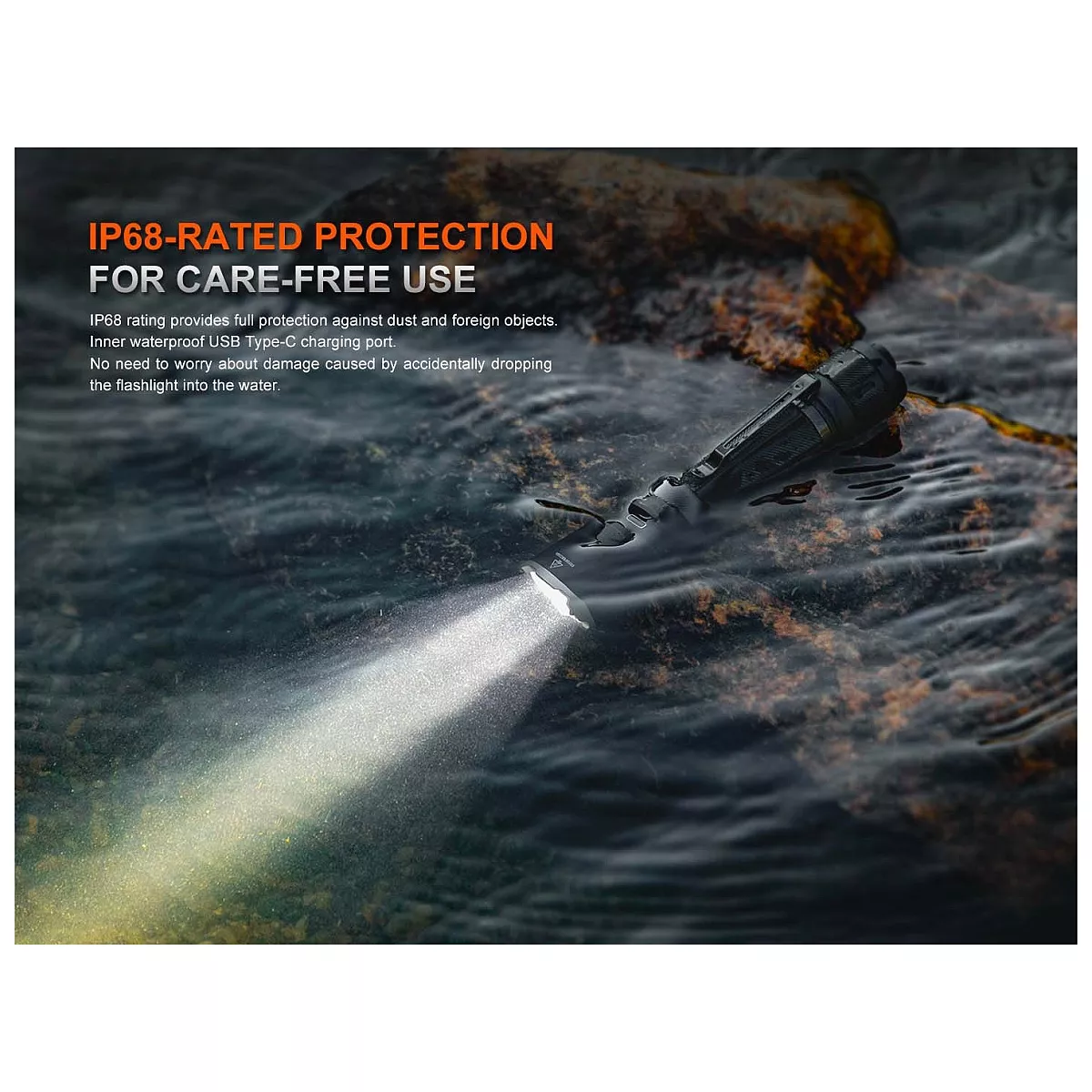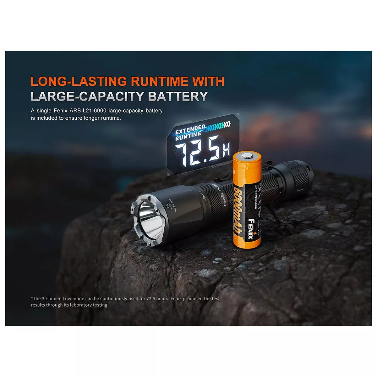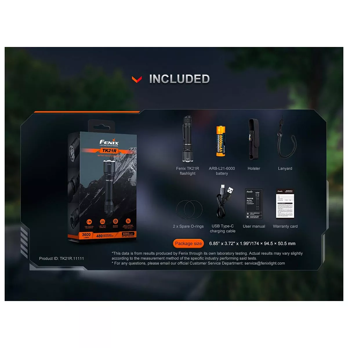 - Ke svítilně je přiložen akumulátor Fenix ARB-L21-6000, nabíjecí kabel USB-C, šňůrka na zápěstí, pouzdro na opasek a náhradní O-kroužek.