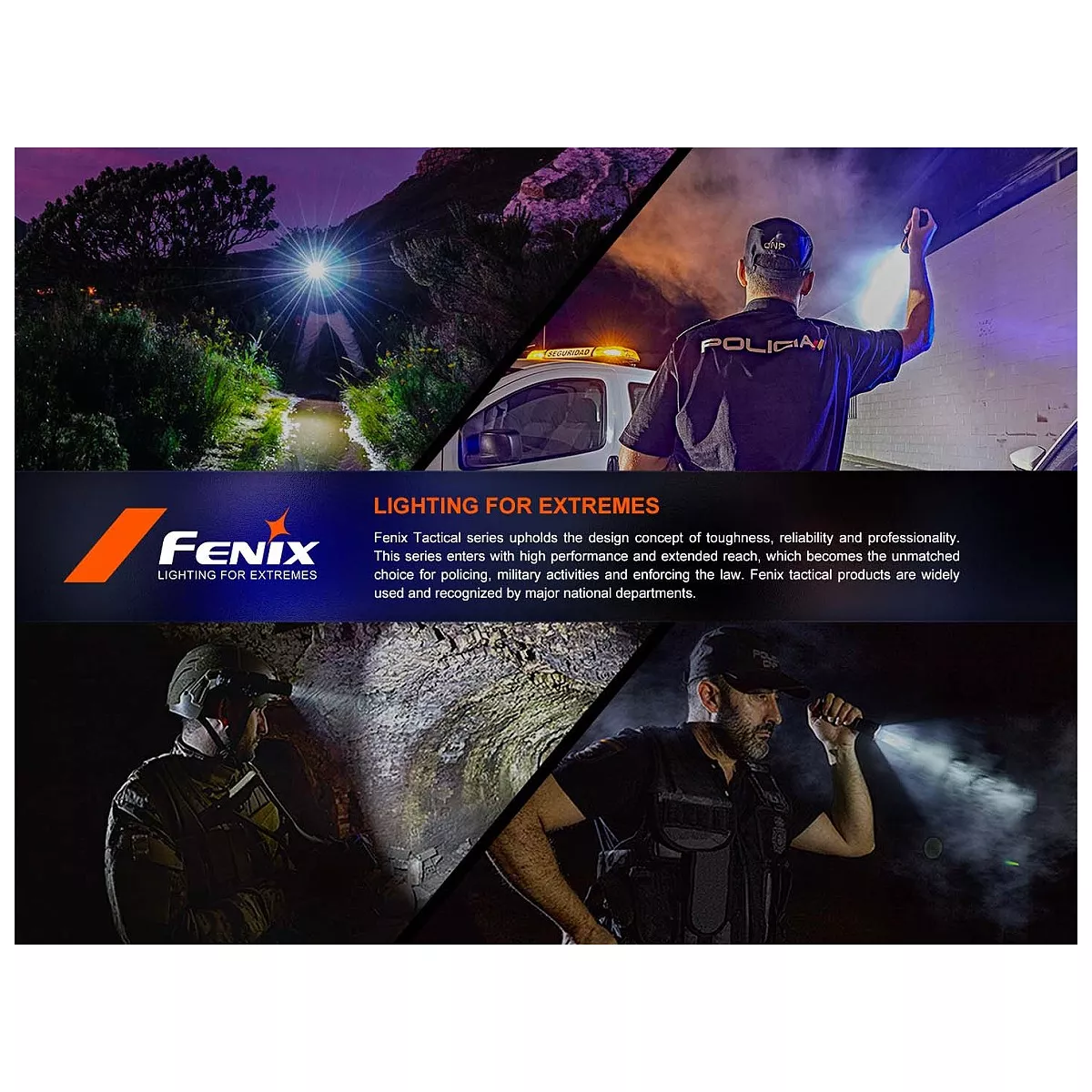 - Jako volitelné příslušenství lze dokoupit: taktický kroužek Fenix ALR-01, kabelový spínač AER-05 a AER-04 (bez stroboskopu, maximální výkon je omezen na 1200 lm), bílý difuzér AOD-M, bílý a červený dopravní kužel AOT-04.