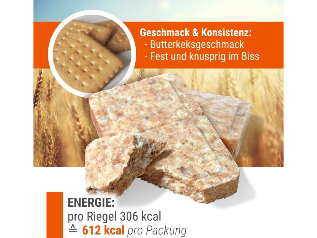 Sušenky jsou trvanlivé do 10/2035 a proto ideální jako dlouhodobé nebo nouzové potraviny. Balení obsahuje 2 porce, které jsou jednotlivě zabalené, aby byly tyčinky optimálně chráněné.