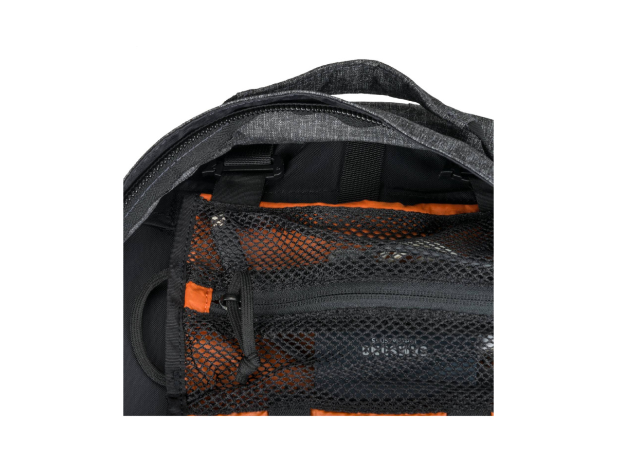 Vyrobeno z lehké, ale odolné tkaniny. Srolovatelné a zajištěné suchým zipem. Na vnitřní straně jsou tři síťované kapsy na zip a elastická poutka. Tři poutka na šňůru umožňují zavěsit organizér pro snadnější přístup k přenášeným nezbytnostem.