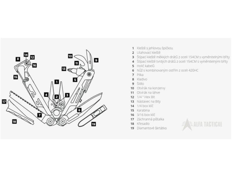 Tento multifunkční nástroj obsahuje nástroje, které jsou přístupné ve složené nebo zavřené poloze.