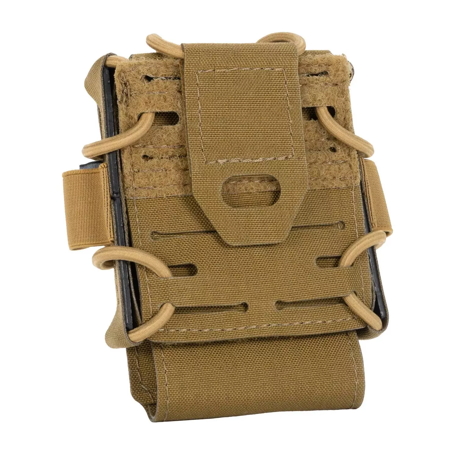 Zajištění tvoří horní části malá chlopeň na suchý zip s nárazovou šňůrkou. Boky a přední stěna pouzdra mají dodatečné polymerové vyztužení. Pouzdro je vyrobeno z odolného laminátu na bázi Cordura 500D a Cordura 1000D.