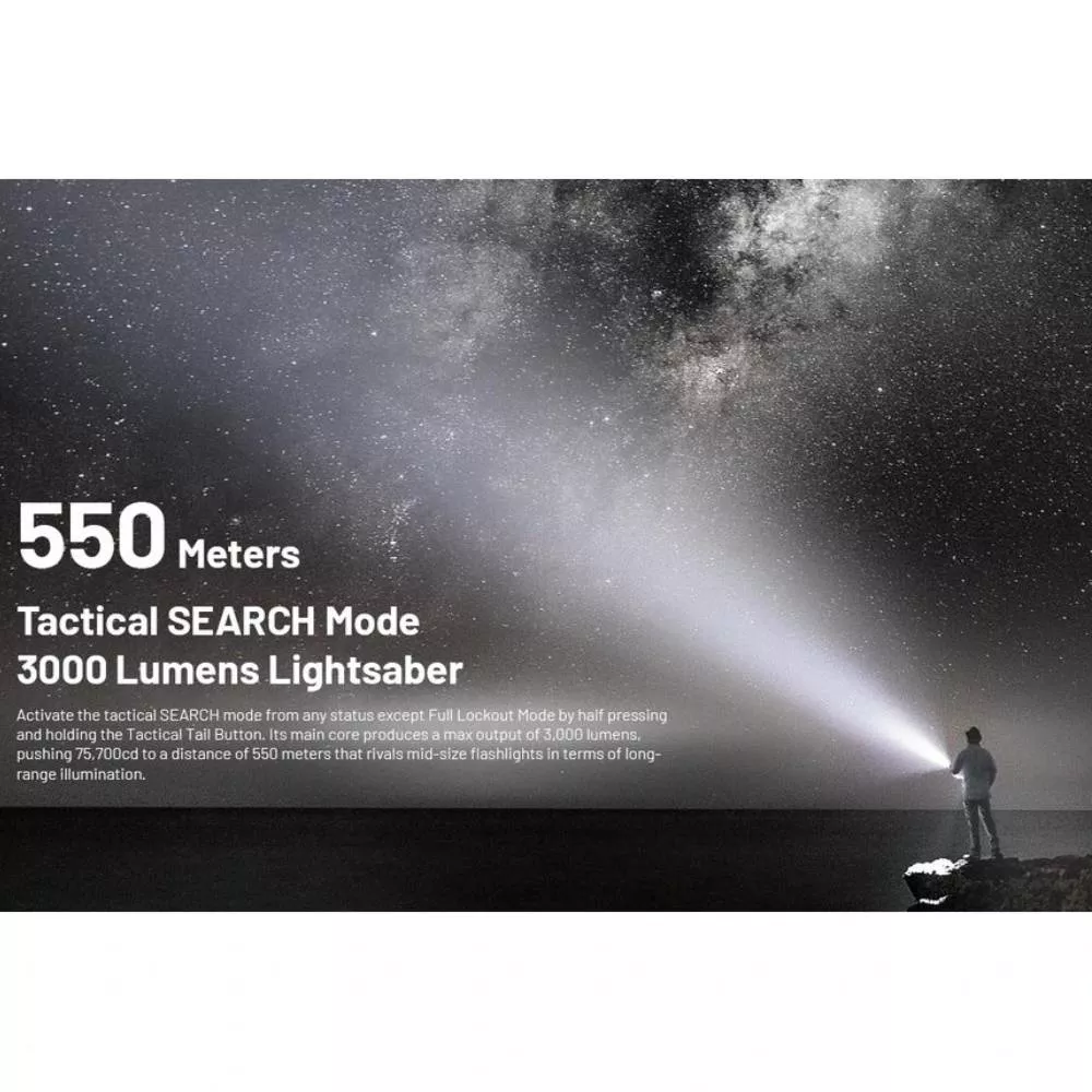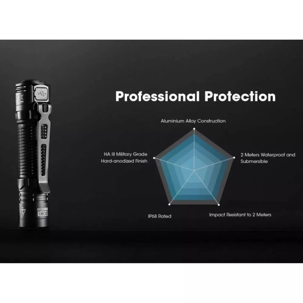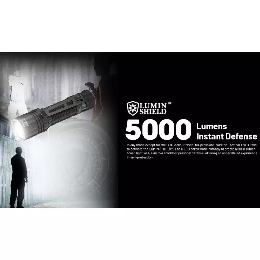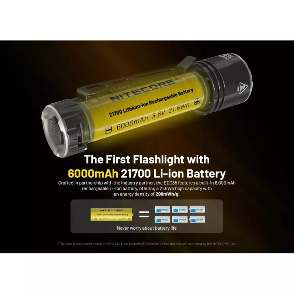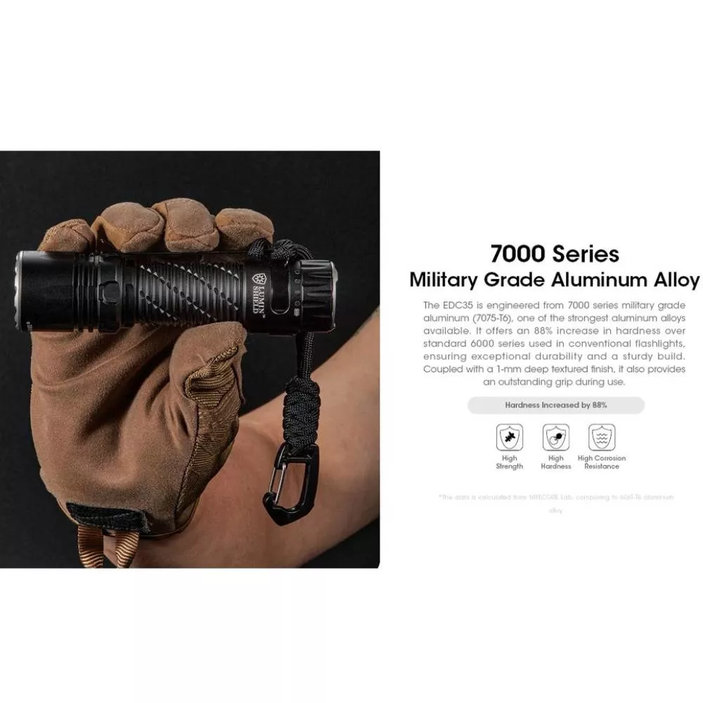 To je ochrana proti nechtěnnému propálení např. kalhot uživatele. Svítilna disponuje 4 světelnými režimy svitu a dvěmi speciálními módy. To je tzv. LUMIN SHIELD (FLOODLIGHT - světelný štít), kdy EDC35 svítí výkonem 5 000 lumenů intenzivního širokého světla vhodného pro oslnění útočníka nebo propátrání bližších vzdáleností jako jsou chodby a místnosti. Vhodné pro použití např. se zbraní. Druhý režim SEARCH (Spotlight) s výkonem 3 000 lumenů spíše bodového dalekonosvého světla slouží pro nasvícení dlouhých vzdáleností. Vestavěný Li-Ion akumulátoru velikosti 21700 o kapacitě 6000mAh je napájen přes integrovaný micro USB-C konektor zabudovaný přímo ve svítilně. Ten je chráněn rotačním ochranným krytem. Pod tímto prstencem se nachází i indikátor stavu nabitosti akumulátoru. NITECORE EDC35 má tělo vyrobené z hliníku vojenské kvality ze série 7000. Při své délce svítilny 124,3 mm má EDC35 hmotnost 171 g. Stupeň krytí IP68 to znamená odolná vůči pádu z výšky 2 metrů a vodeodolní do hloubky až 2 metrů.