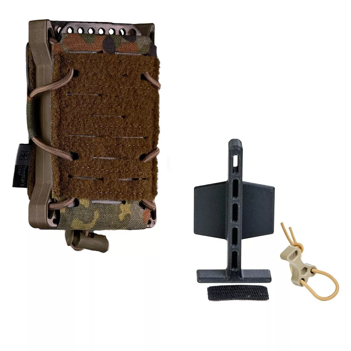 Vyrobeno z ABS plastu vyztuženého skelnými vlákny (vytištěno 3D tiskem) pro odolnost a nízkou hmotnost. Nastavitelné pro širokou škálu pistolových a PM zásobníků v různých výškách.