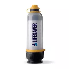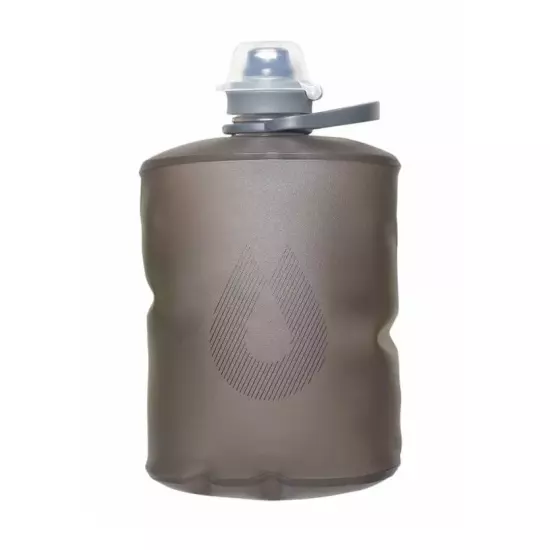 Flexibilní láhev od firmy Hydrapak, kterou po vypití nápoje lze složit na minimální rozměry a zajistit silikonovým poutkem, které může sloužit k zavěšení láhve.
