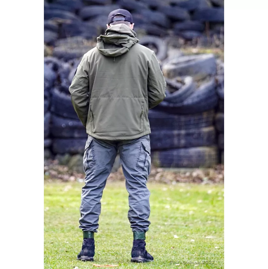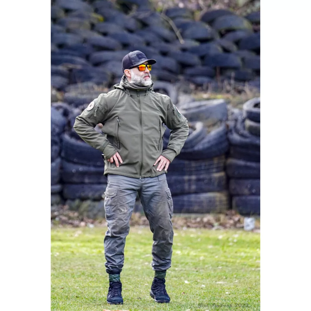 Taktická softshellová bunda s odepínací kapucí.