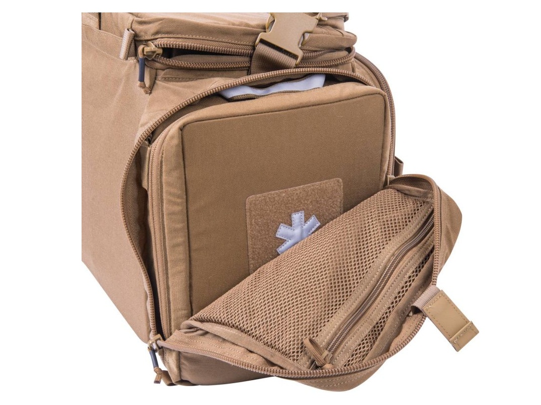 Po celé tašce je rozmístěno mnoho malých panelů na suchý zip pro identifikaci obsahu pomocí Helikon-Tex® Tag Patch®. Vnitřek je lemován velkými panely na suchý zip, které umožňují plné přizpůsobení obsahu. Brašna je plně kompatibilní se systémem Versatile Insert System, který umožňuje připevnit pouzdra, sumky, lékárničky a tak dále. Celá taška je vyztužená a vyrobena z extrémně odolného materiálu Cordura® 500D a 1000D. Široký popruh Universal Carrying Strap® a robustní rukojeti umožňují pohodlné nošení i s velmi těžkým nákladem.