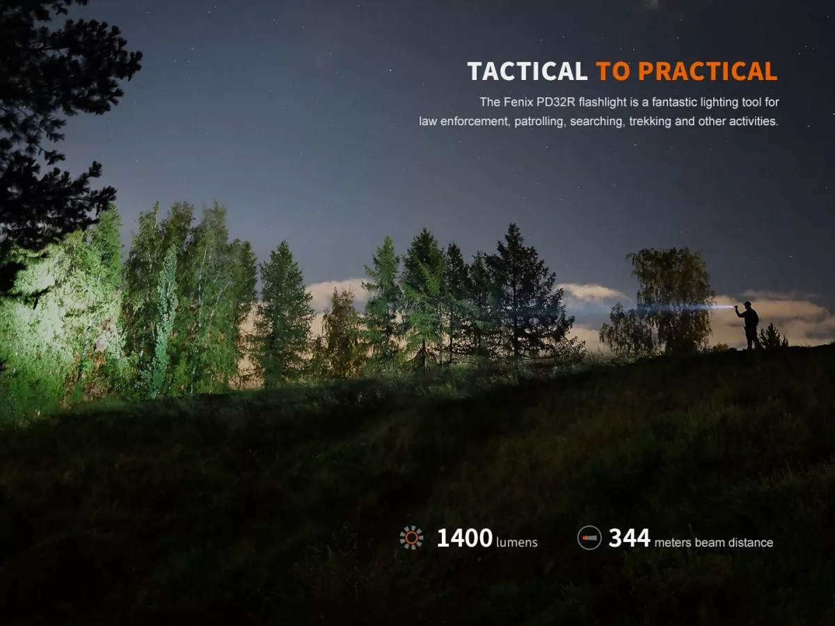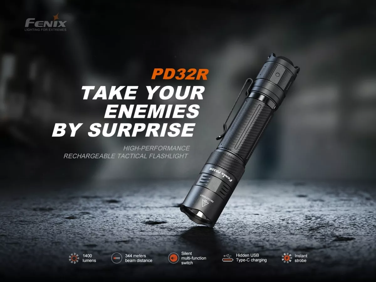 Nabíjecí taktická svítilna Fenix PD32R nabízí vysoký světelný tok až 1400 lumenů (ANSI) a úctyhodný dosvit až 344 metrů. Nadstandardního dosvitu (vzhledem k velikosti svítilny) bylo dosaženo použitím špičkové LED Luminus SFT-40, která vytváří velmi dobře zaostřený kužel. Svítilnu je možné napájet jedním Li-ion 18650 akumulátorem, který je součástí balení nebo ze dvou jednorázových CR123A baterií. Akumulátor se dobíjí přes USB-C konektor důmyslně ukrytý pod šroubovací krytkou u hlavy svítilny, kde je umístěna i indikace míry jeho nabití. Fenix PD32R disponuje pěti různými režimy svícení, které umožní volit mezi vysokým výkonem a dlouhou výdrží (až 70 hodin). Disponuje také zábleskovým režimem pro upoutání pozornosti a pro krizové situace, který lze rychle aktivovat z vypnutého stavu držením stisknutého taktického tlačítka. PD32R zaujme nejen kompaktní velikostí a skvělým výkonem, ale i dvoupružinovou konstrukcí, díky které skvěle odolává zpětným rázům při použití na zbrani. Na dlouhé zbrani ji lze ovládat kabelovým spínačem Fenix AER-02. Můžeme ji proto doporučit pro použití v bezpečnostních složkách i pro běžné outdoorové a lovecké použití.