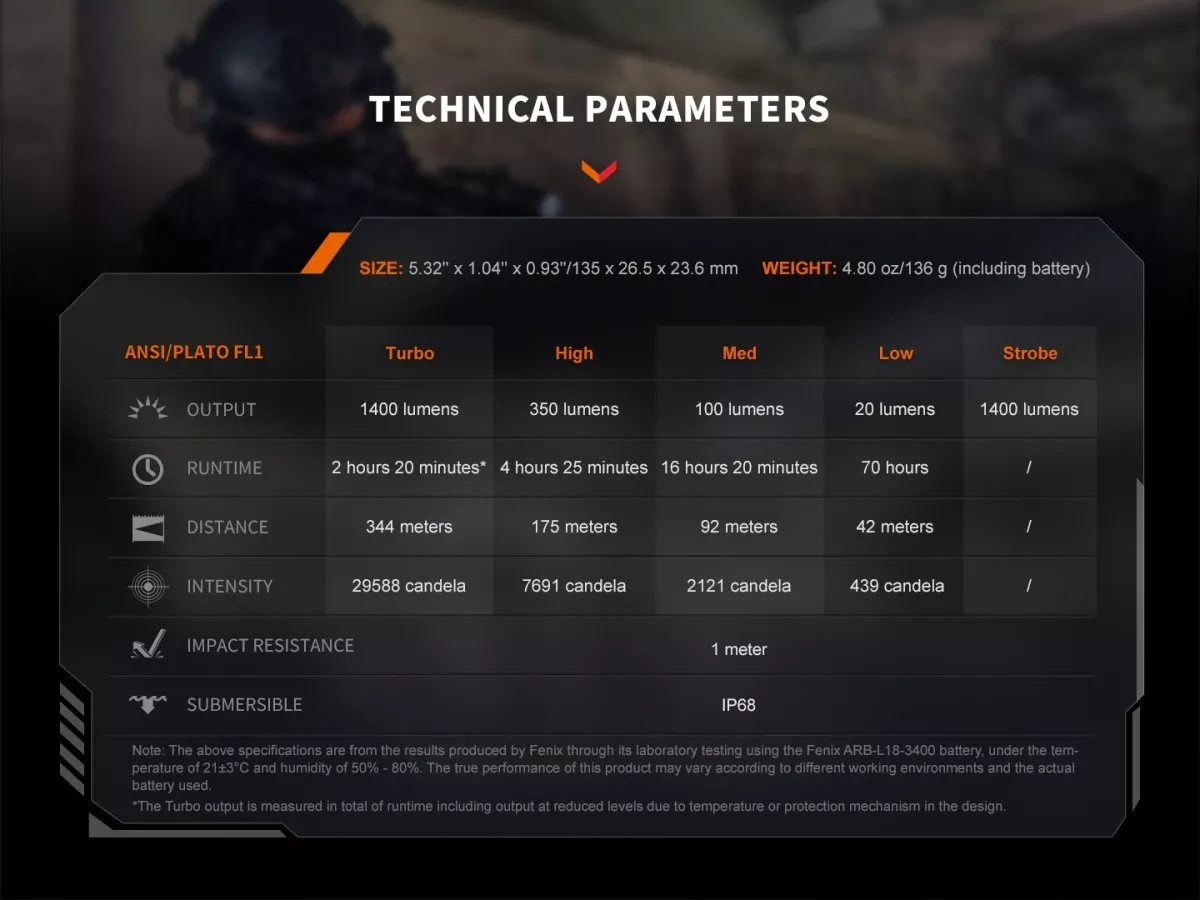 - Světelný tok a časy výdrže jsou měřeny s nabíjecí Li-ion baterií Fenix 18650 s kapacitou 3400mAh (součástí balení).